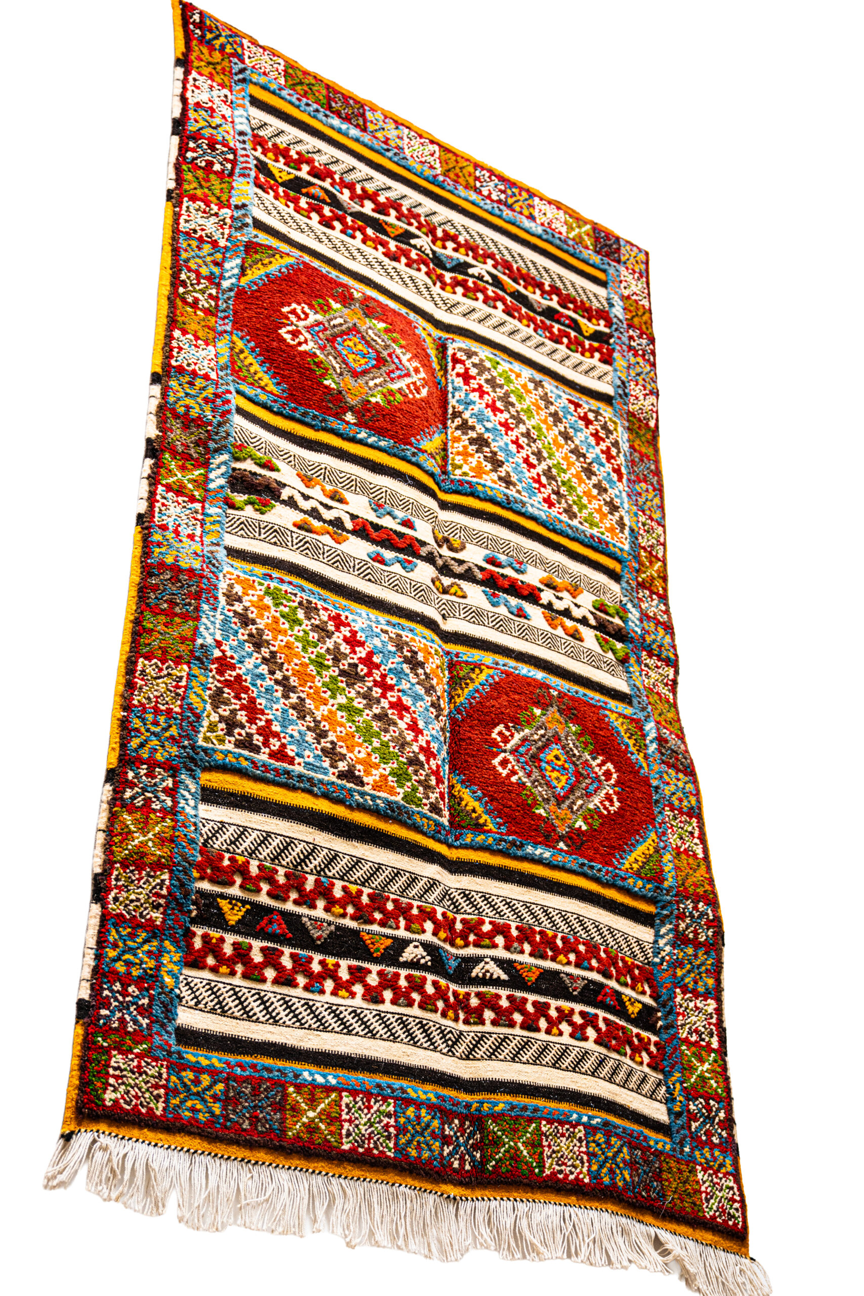 - Dominant Colors: The rug uses a high-contrast palette of natural white/cream wool alternating with densely woven bands of deep crimson red, saffron yellow, black, and multi-colored threads. The side edges (selvedge) are tightly finished in a striking saffron/orange color, a signature Taznakht characteristic seen clearly in the close-up.