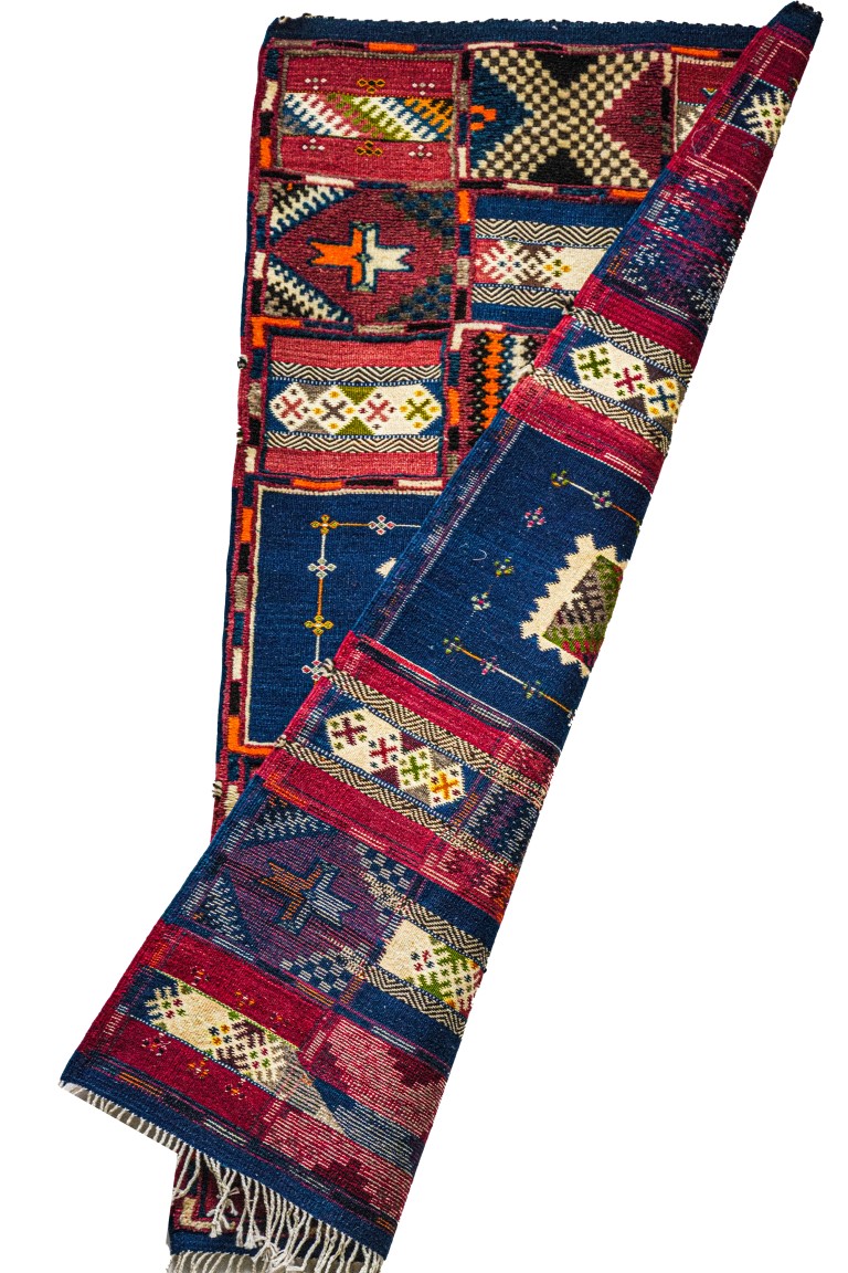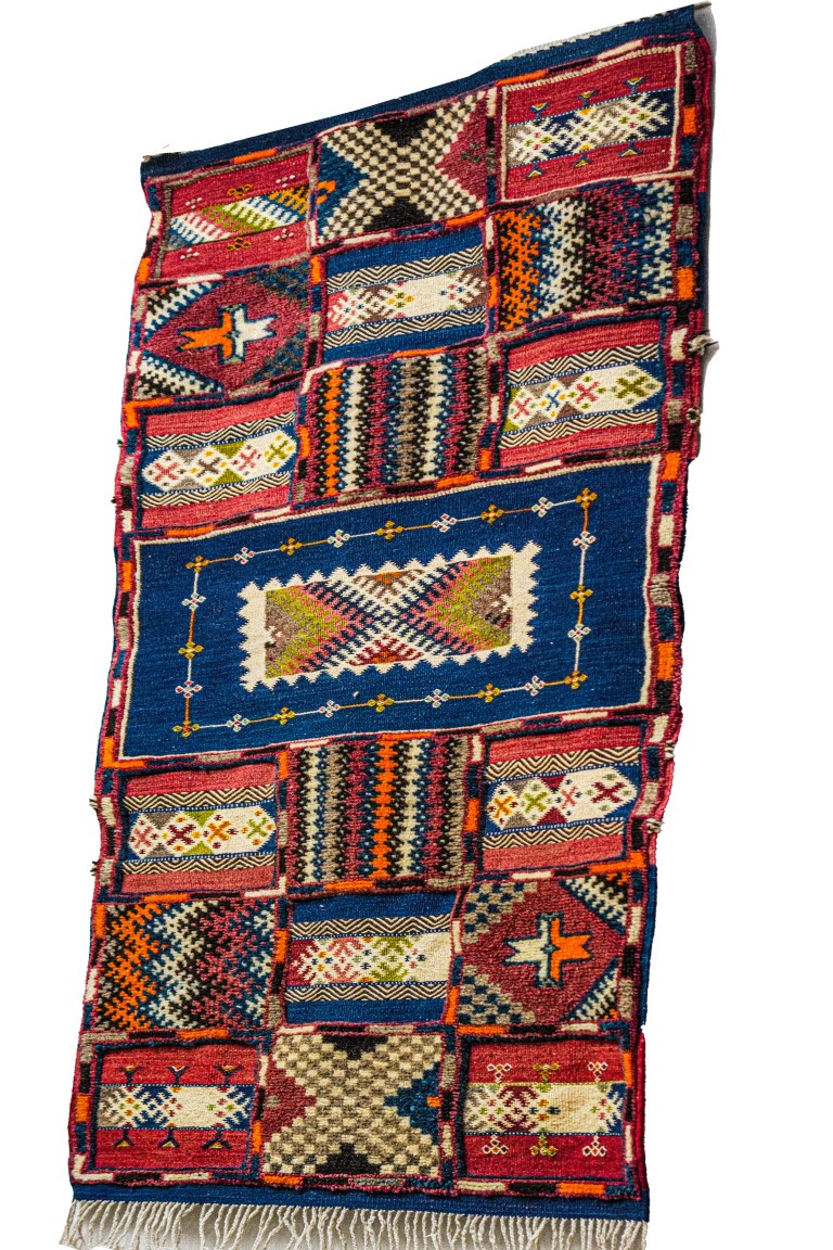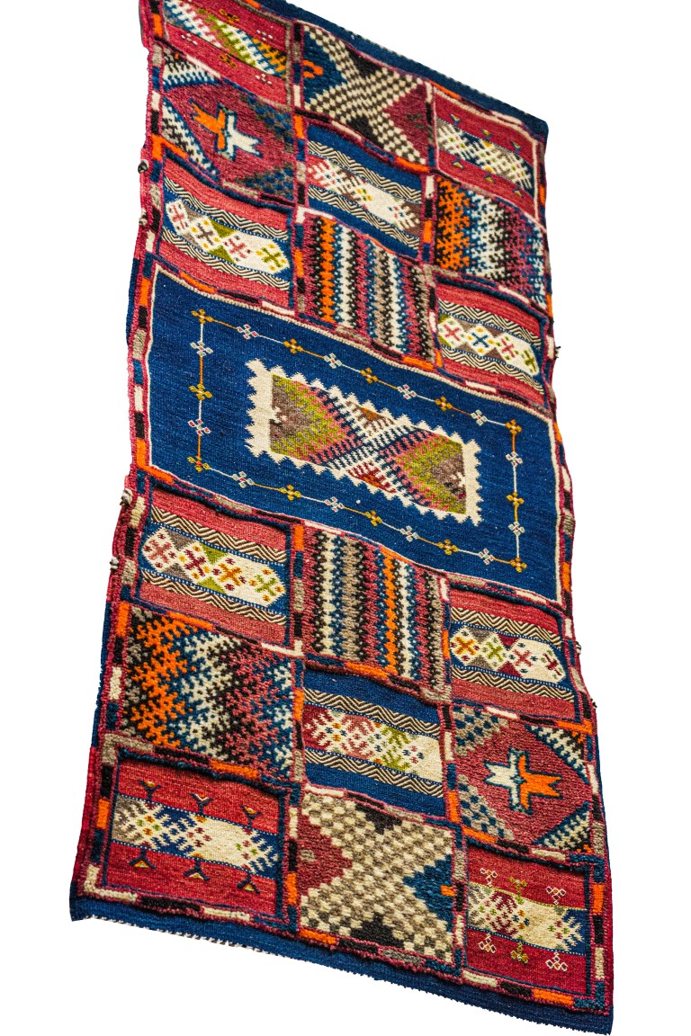 • Style and Origin: Taznakht / Glaoui Runner. Known for its checkerboard-like, mosaic composition where no two squares are exactly alike.