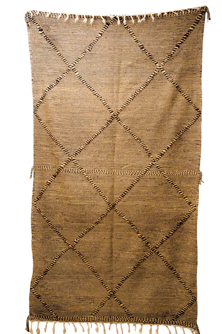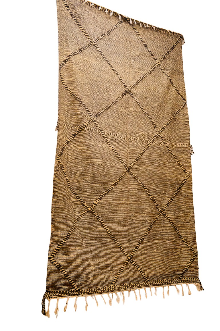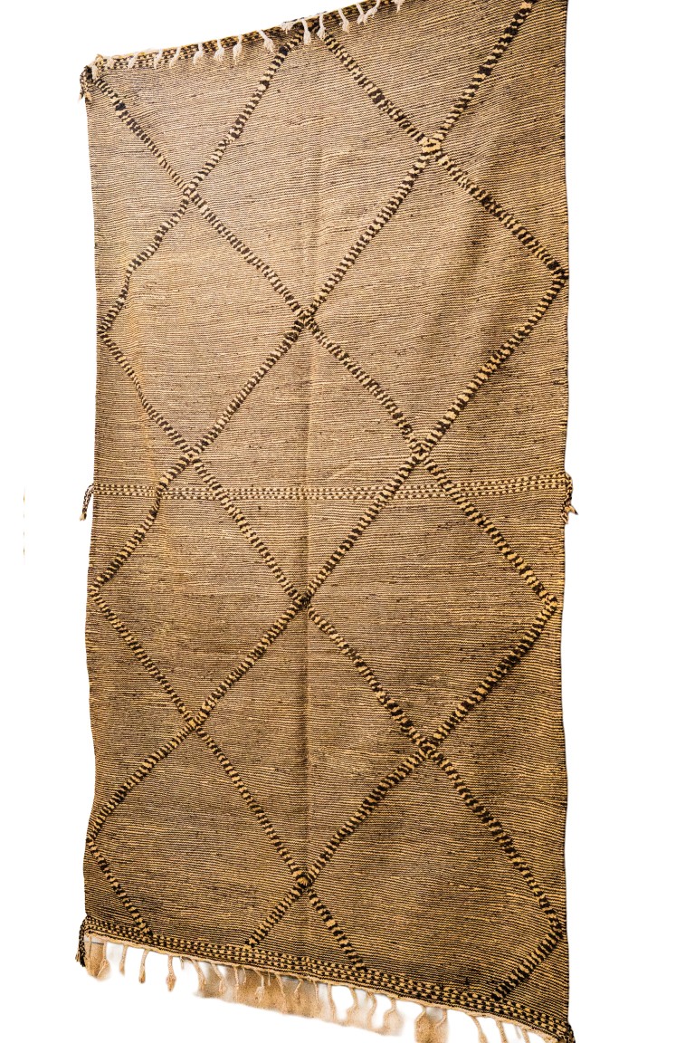 Style and Origin: Zanafi (High Atlas). These rugs are famous for their intricate flat-weaving technique that uses mixed yarn colors to create a textured, “salt and pepper” background.
