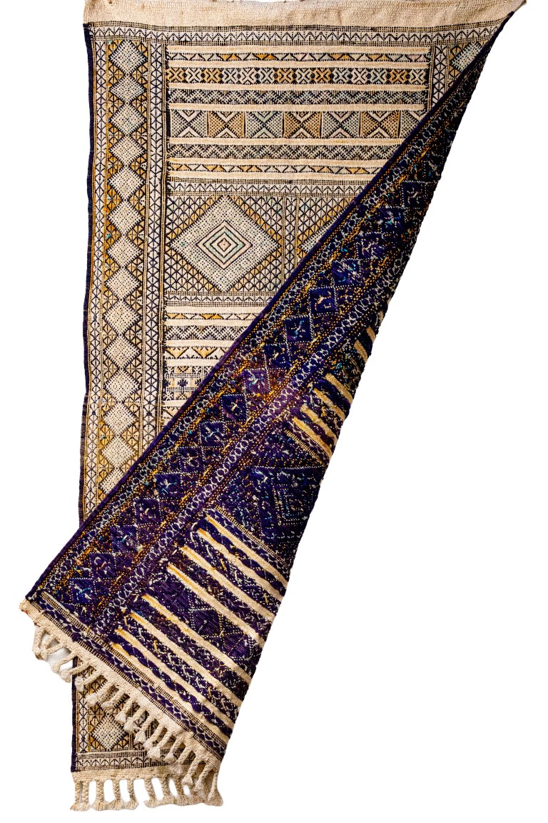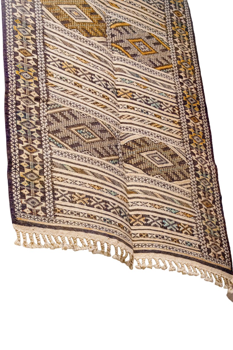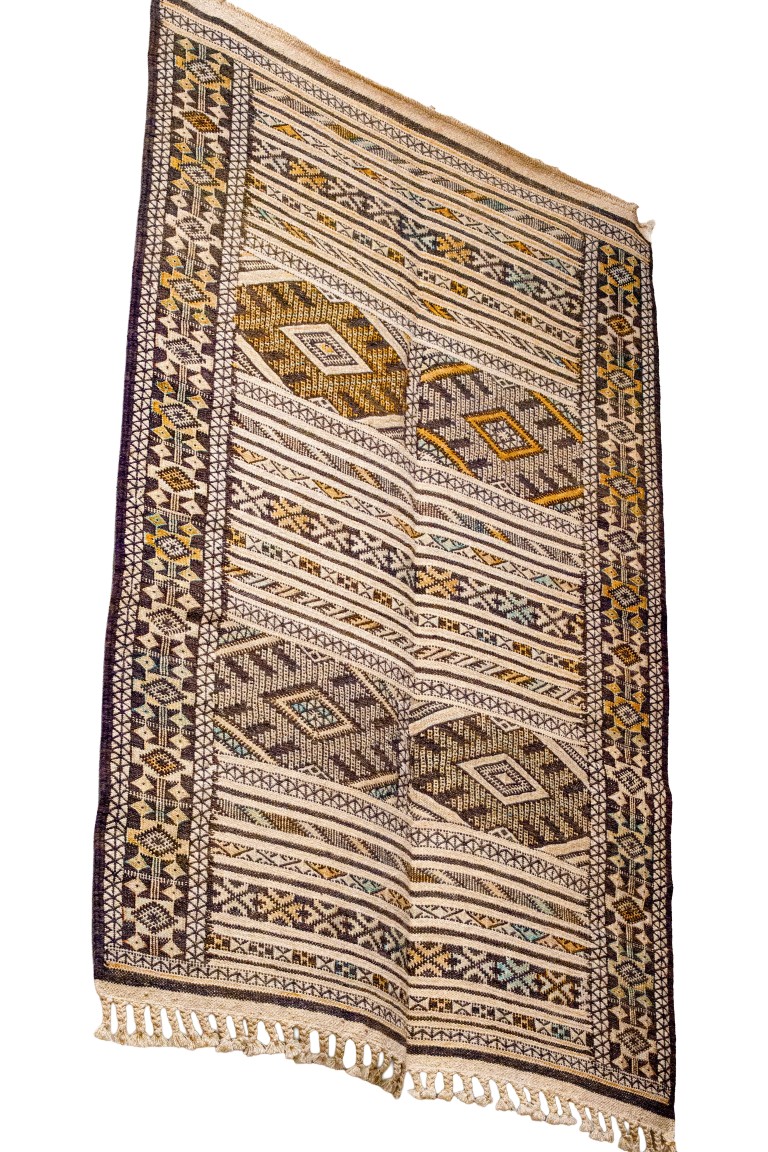 • Style and Origin: Kilim / Hanbel (Moroccan Flatweave). The fine detail and organized bands suggest Zemmour (Middle Atlas) or Taznakht (Southern High Atlas) origins.