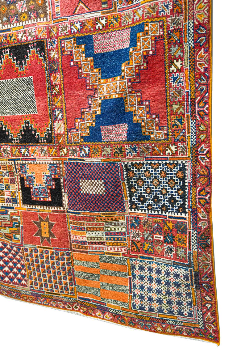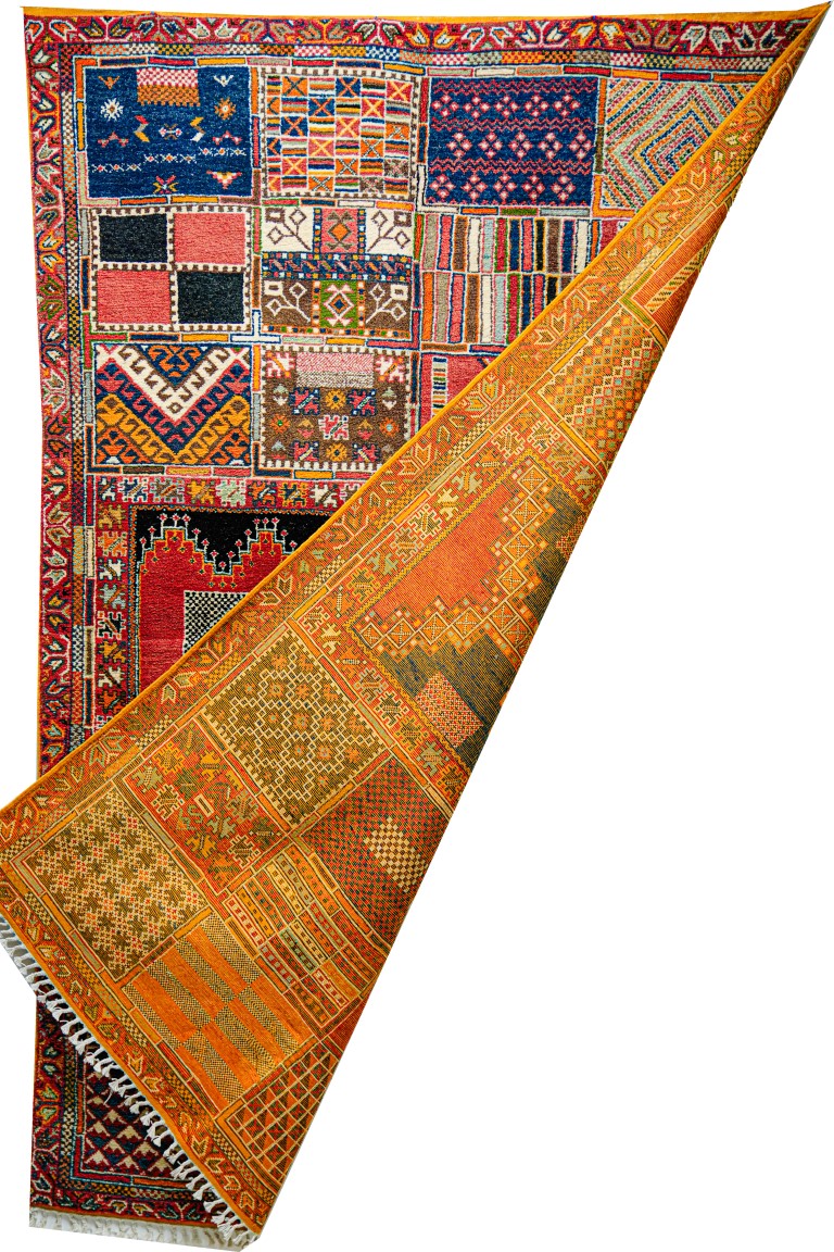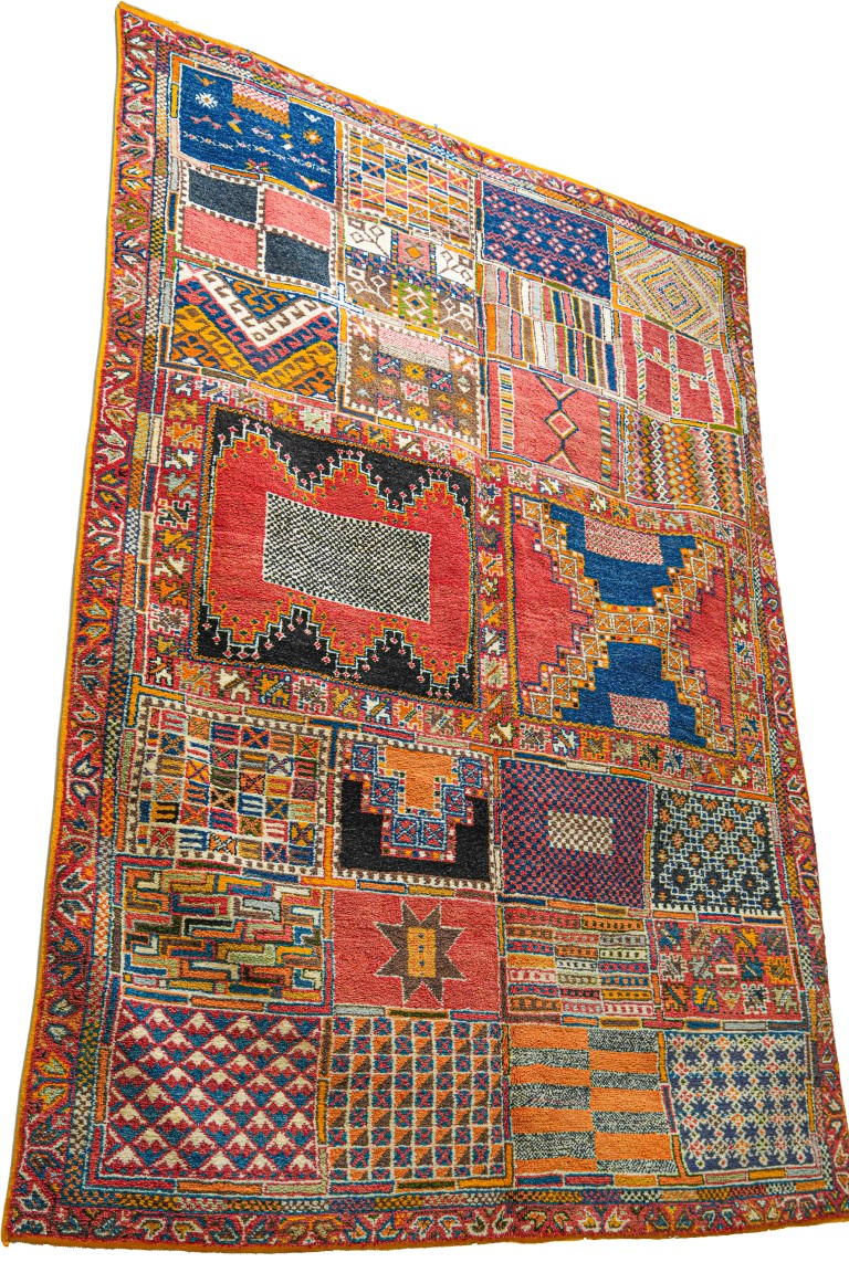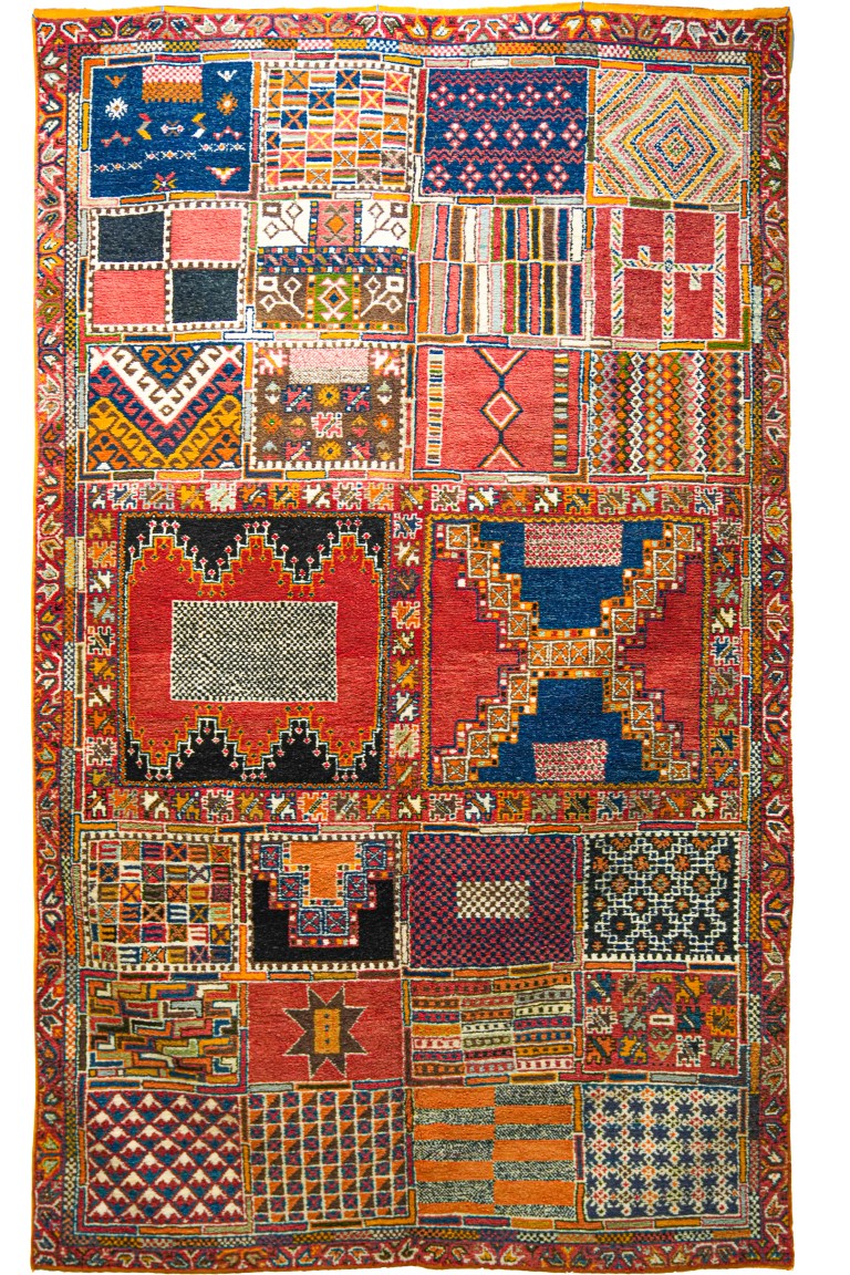 Style and Origin: Taznakht / Glaoui (Southern High Atlas). This style is a pinnacle of Moroccan weaving, known for its “patchwork” or checkerboard layout that showcases the weaver’s entire repertoire of skills.