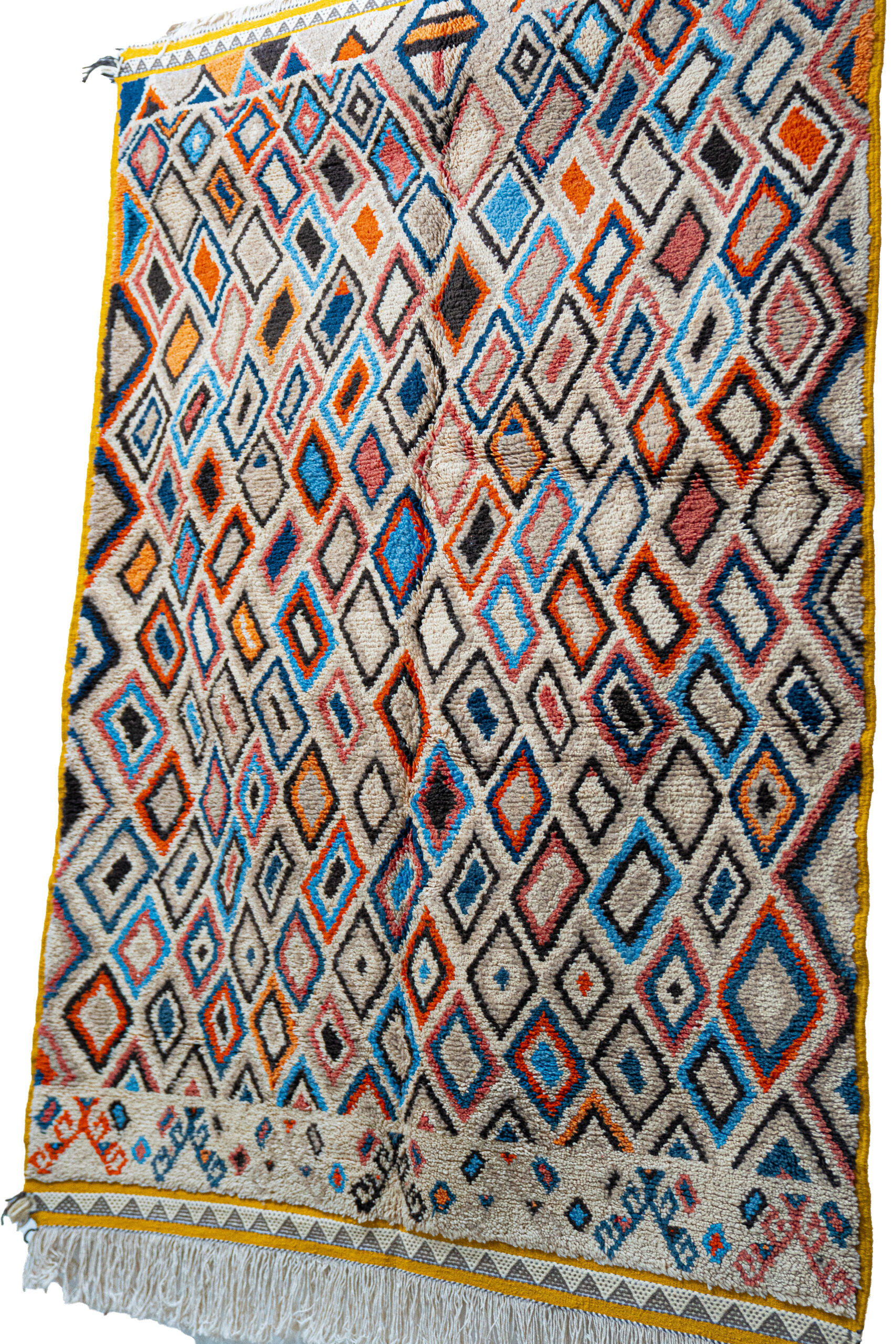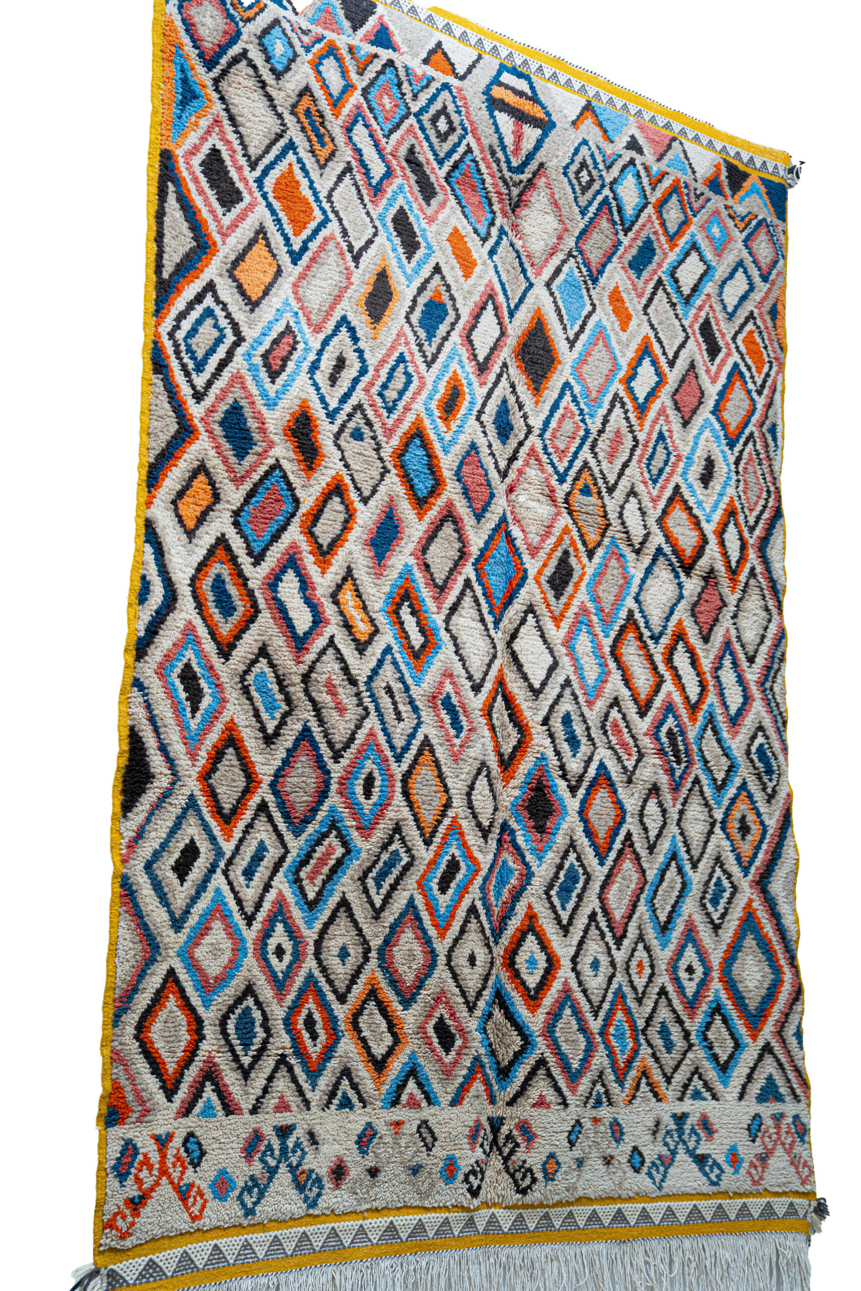 - Palette: The diamonds are filled and outlined with a kaleidoscope of vibrant colors: saffron yellow, bright blue, turquoise, burnt orange, crimson red, and deep black. The way these colors shift and fade into the grey background is a hallmark of high-quality Taznakht weaving, often using naturally dyed wool.