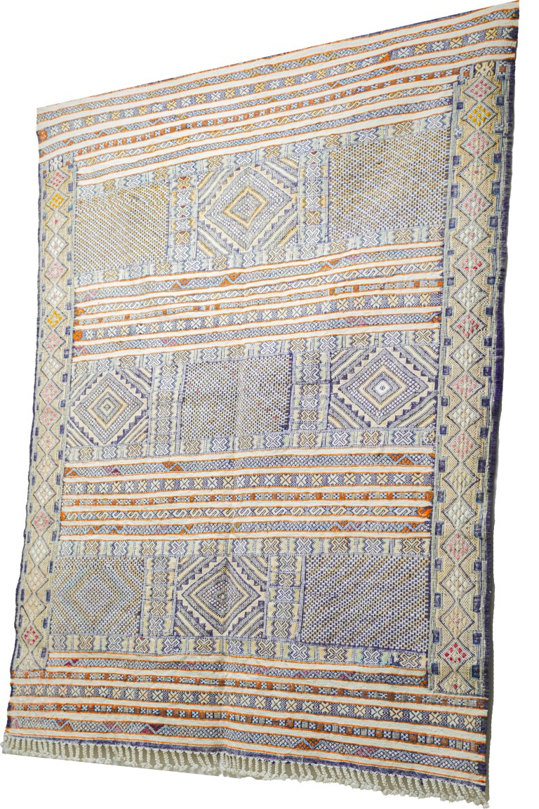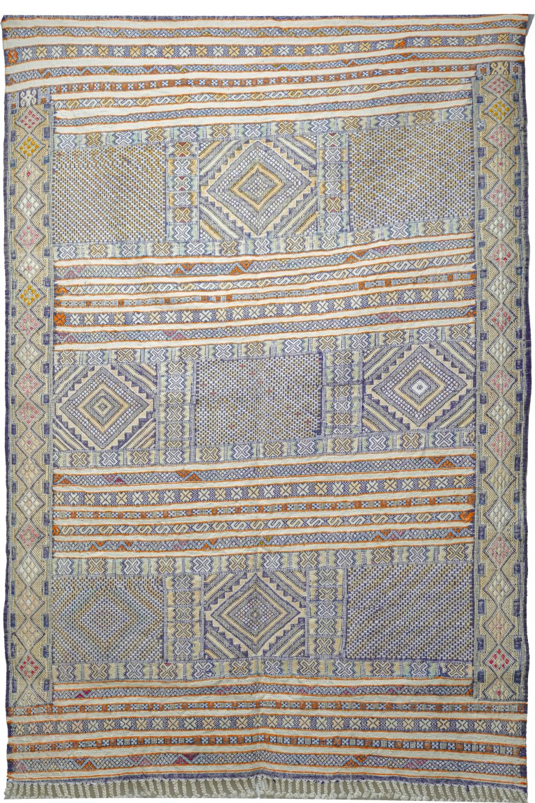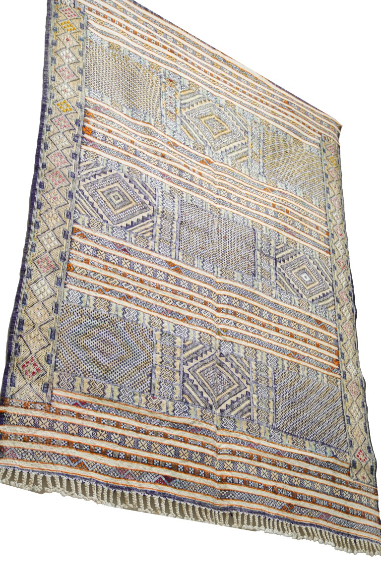 Style and Origin: Kilim / Hanbel (Moroccan Flatweave). This style, with its fine detail and organized bands, is likely from the Zemmour (Middle Atlas) or Taznakht (Southern High Atlas) region.