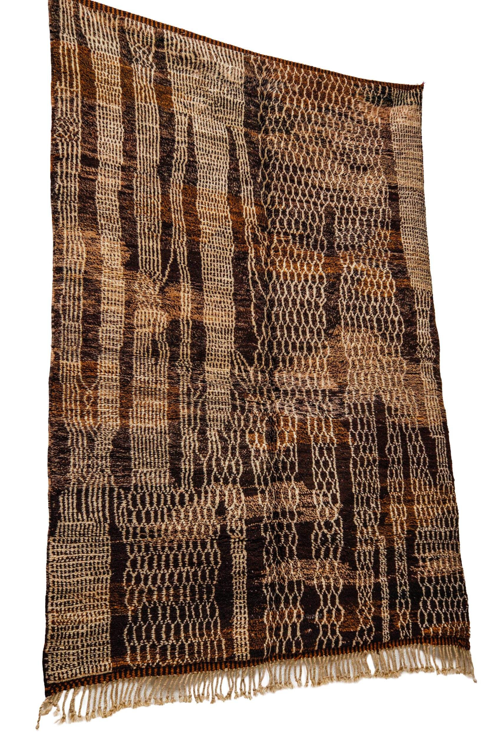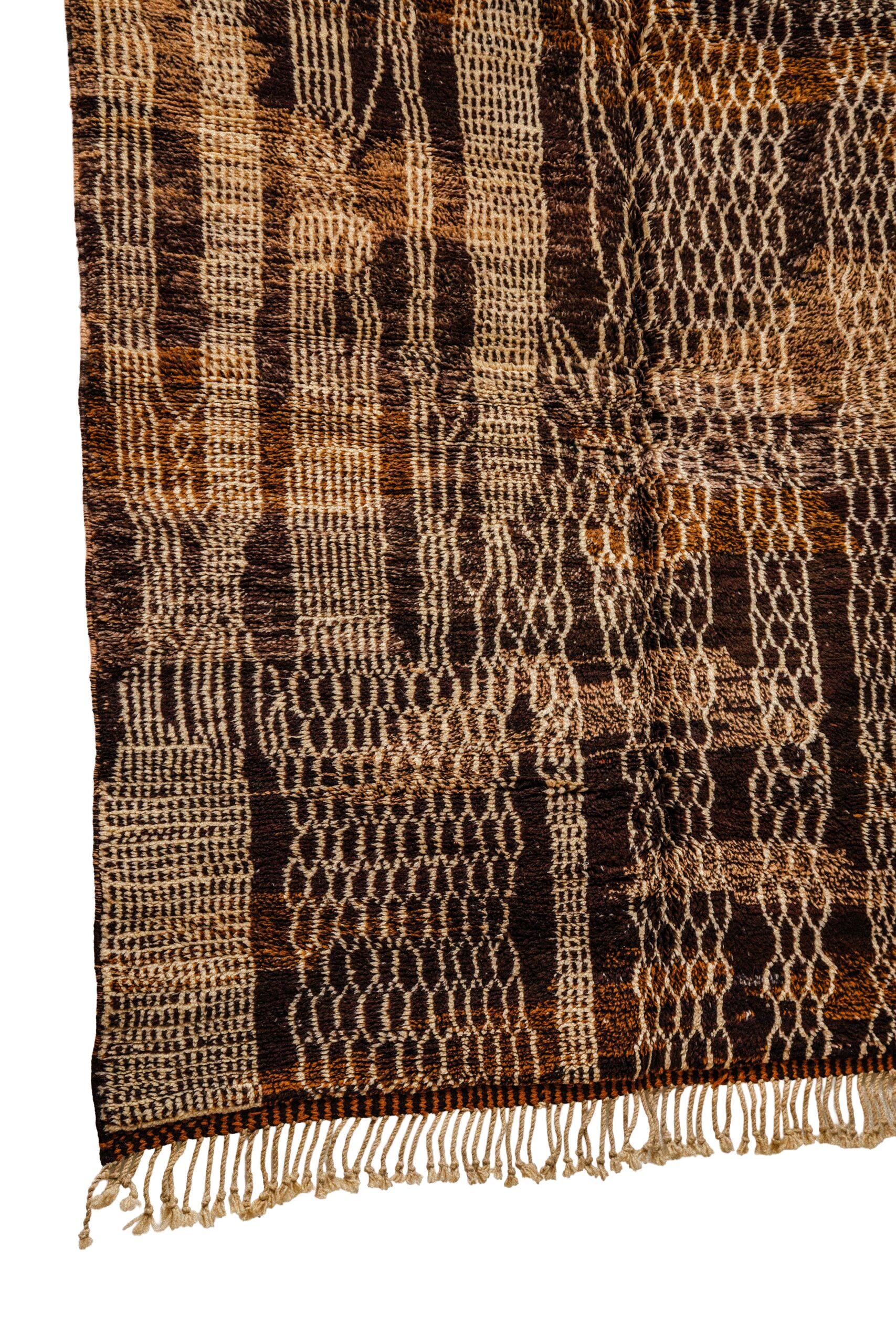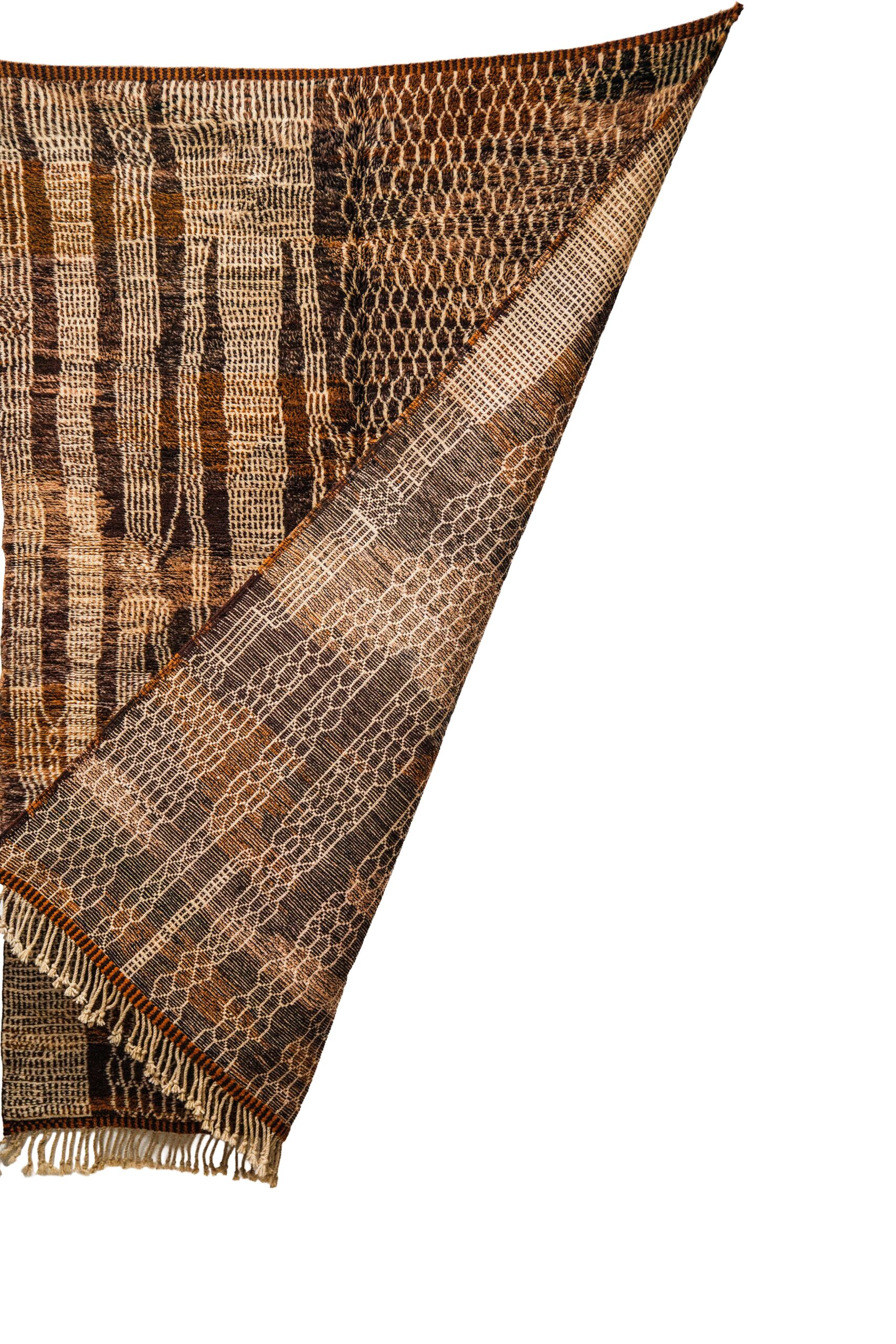 Abstract Geometric Design: The design is a modern, abstract patchwork of intricately woven textures. It features captivating geometric blocks containing honeycomb, chain-link, and grid-like motifs. This unique composition gives the rug an almost architectural, contemporary feel while utilizing ancient Berber weaving techniques.