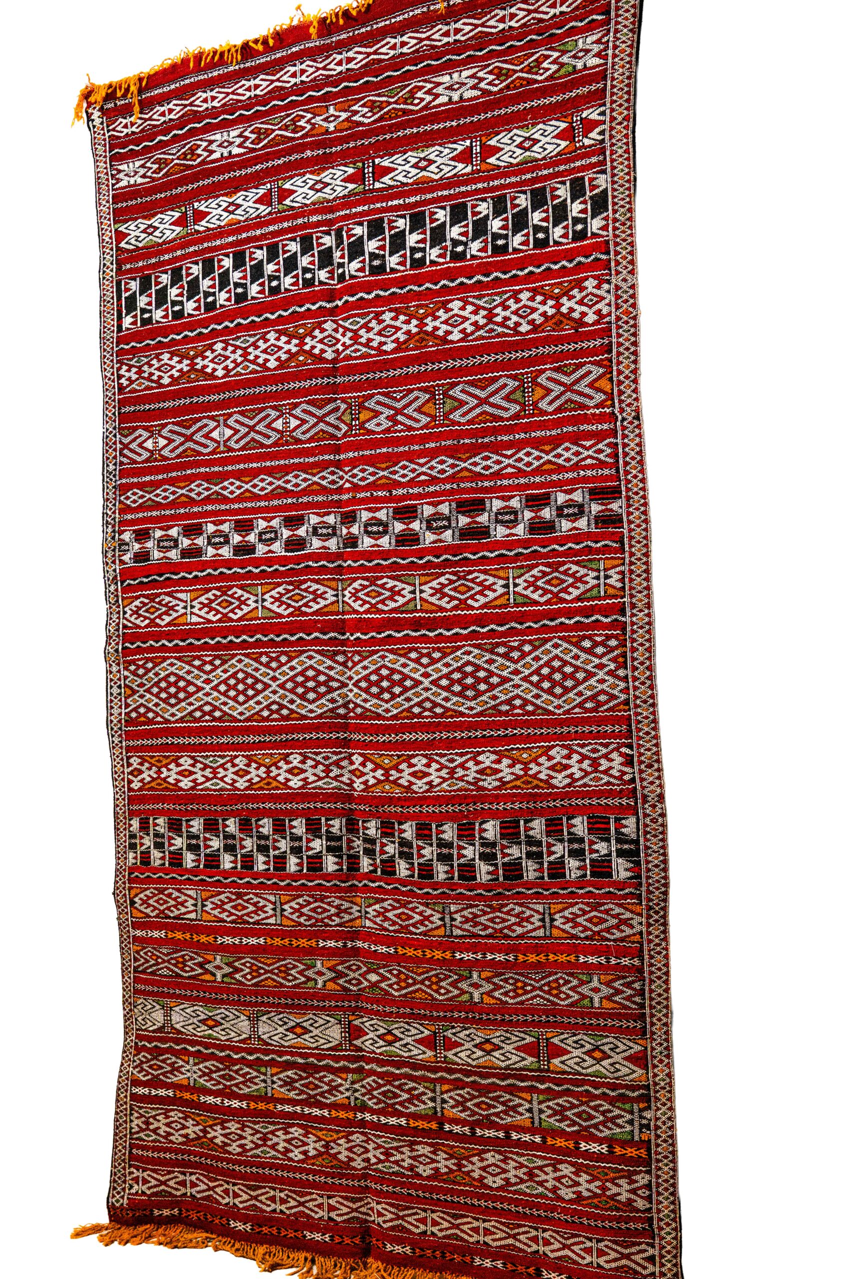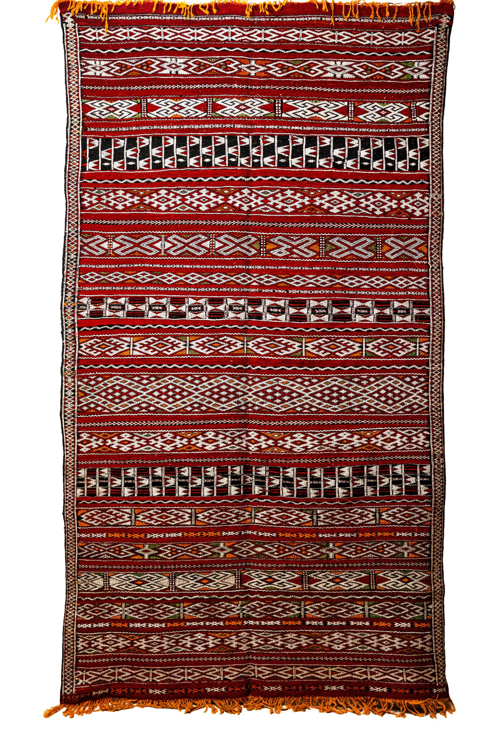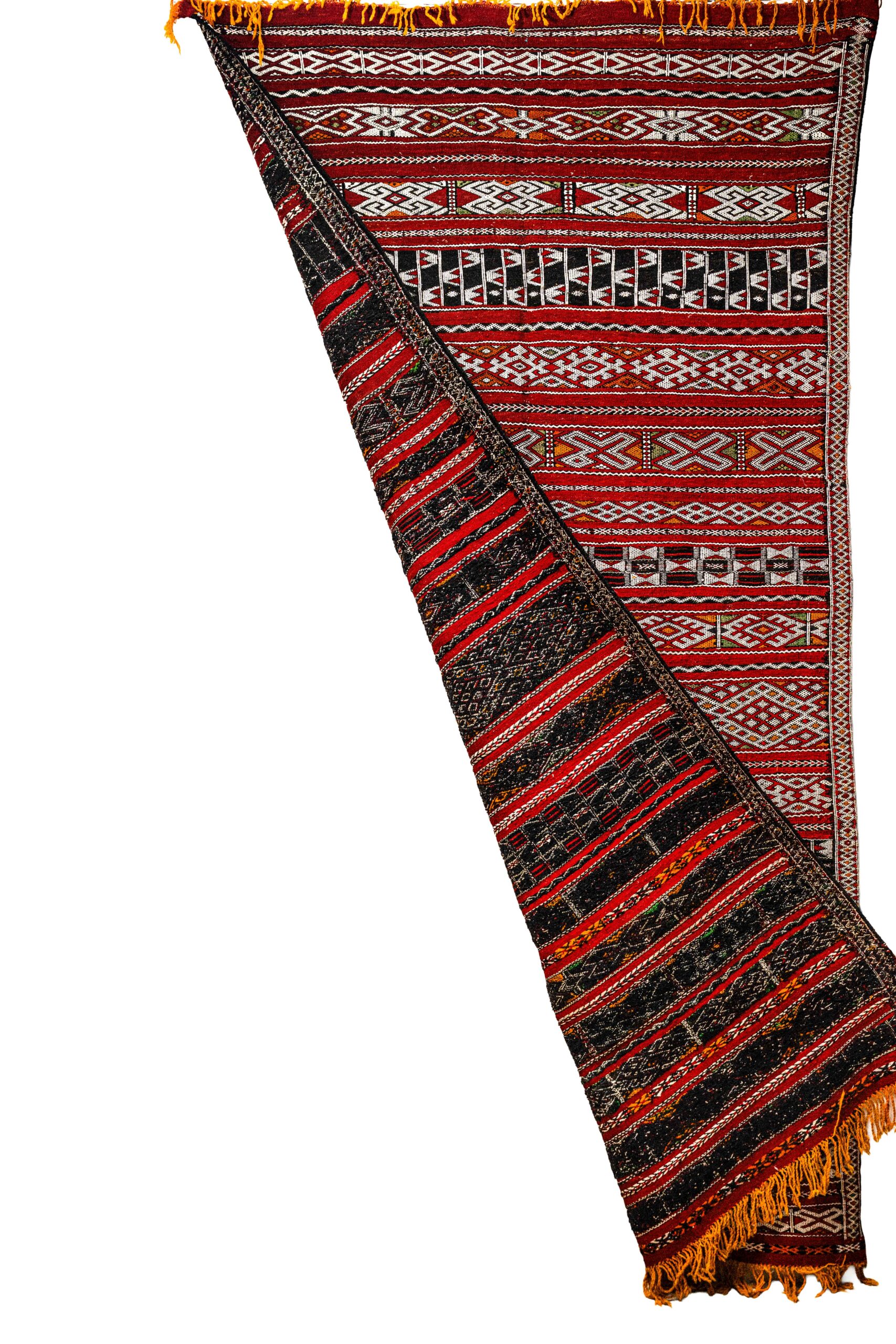 This impressive, handwoven Moroccan Kilim is a brilliant showcase of traditional Berber flatweave artistry. With its deeply saturated colors, heavy weight, and striking geometric detailing, this large rug brings authentic tribal energy and incredible durability to your home.