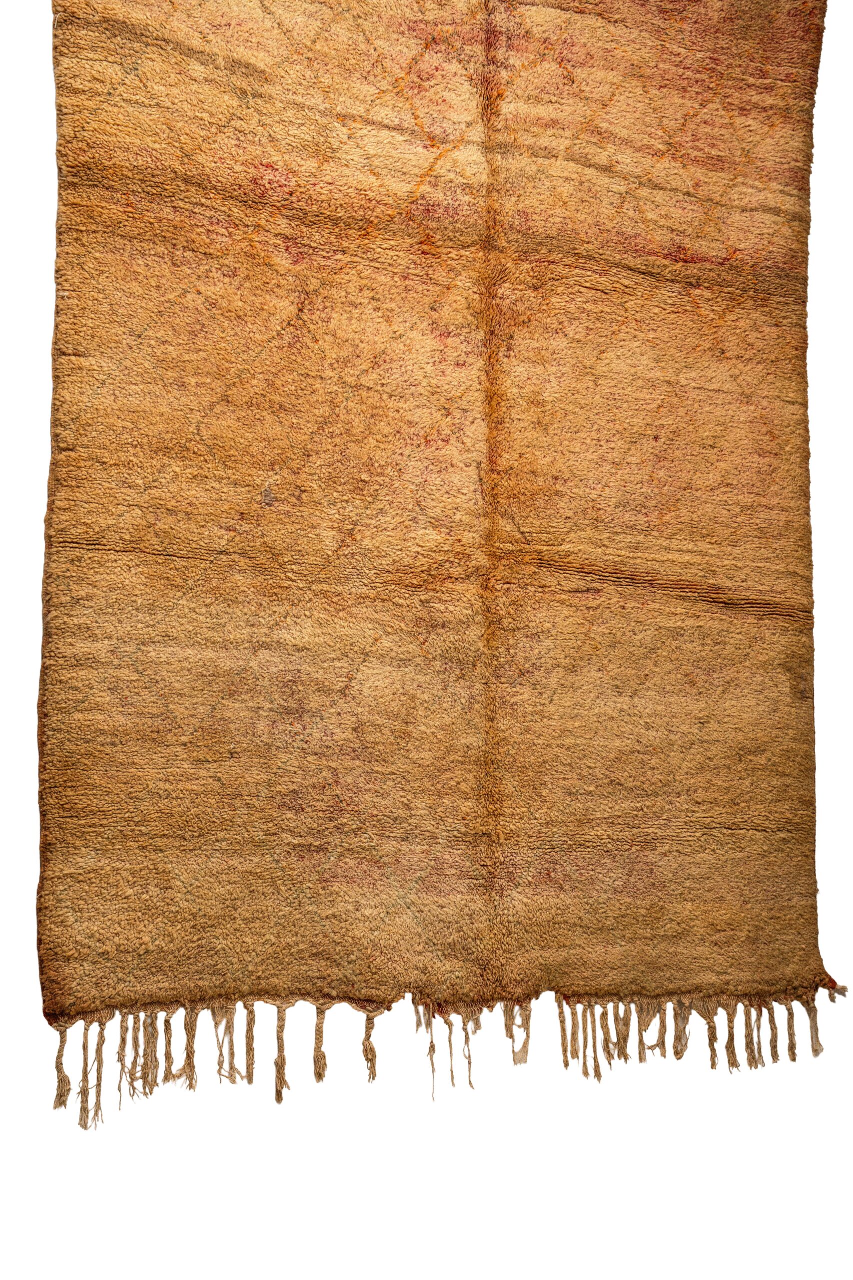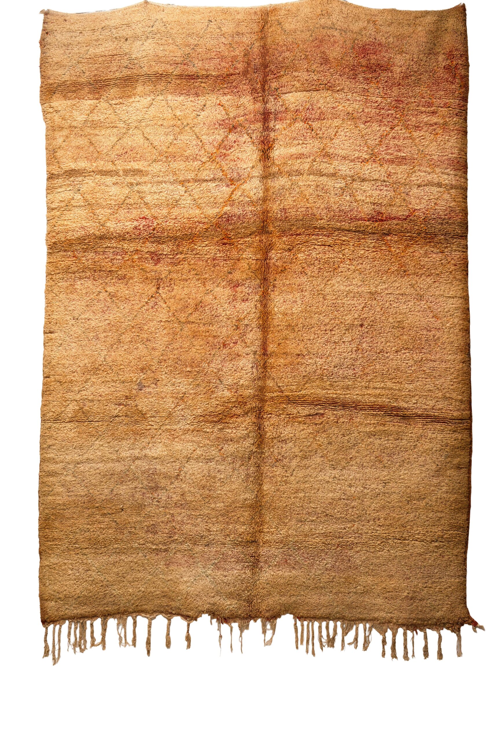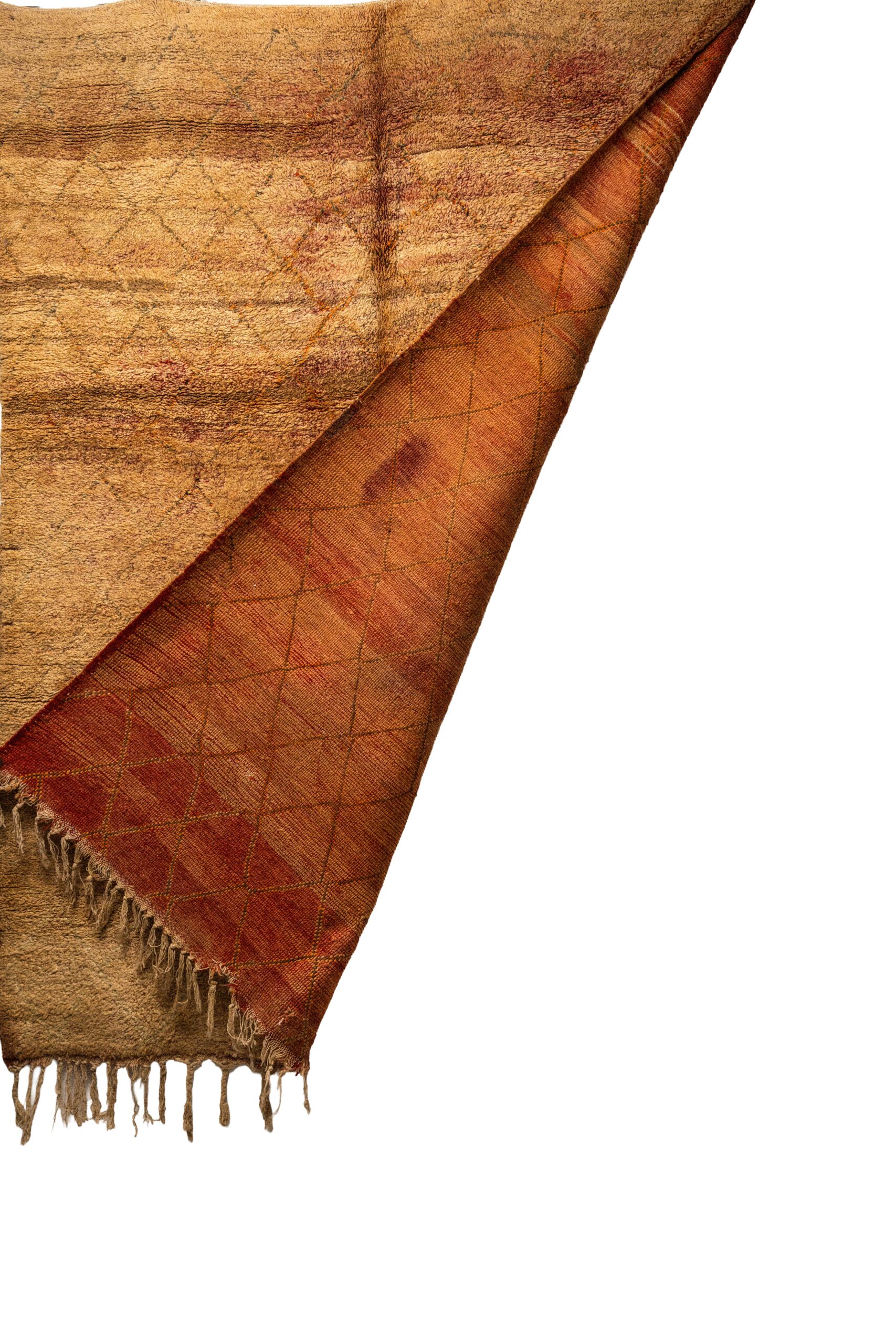 Subtle Geometric Design: Woven seamlessly into the rich, textural background is a classic Beni Ourain-style diamond lattice pattern. Rendered in slightly darker, reddish-brown tones, this subtle geometric design adds beautiful visual depth without overwhelming the rich, solid-color feel of the rug.