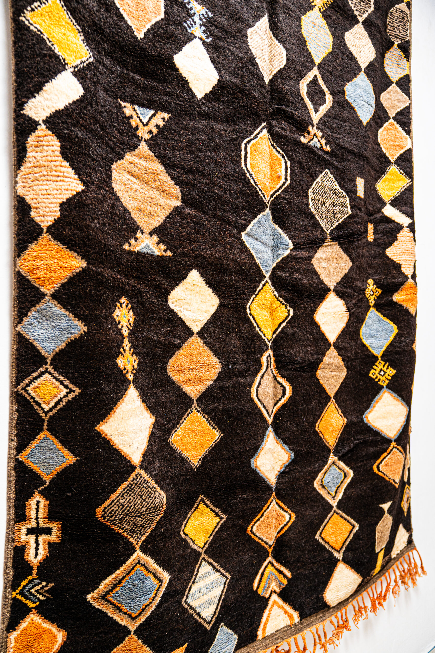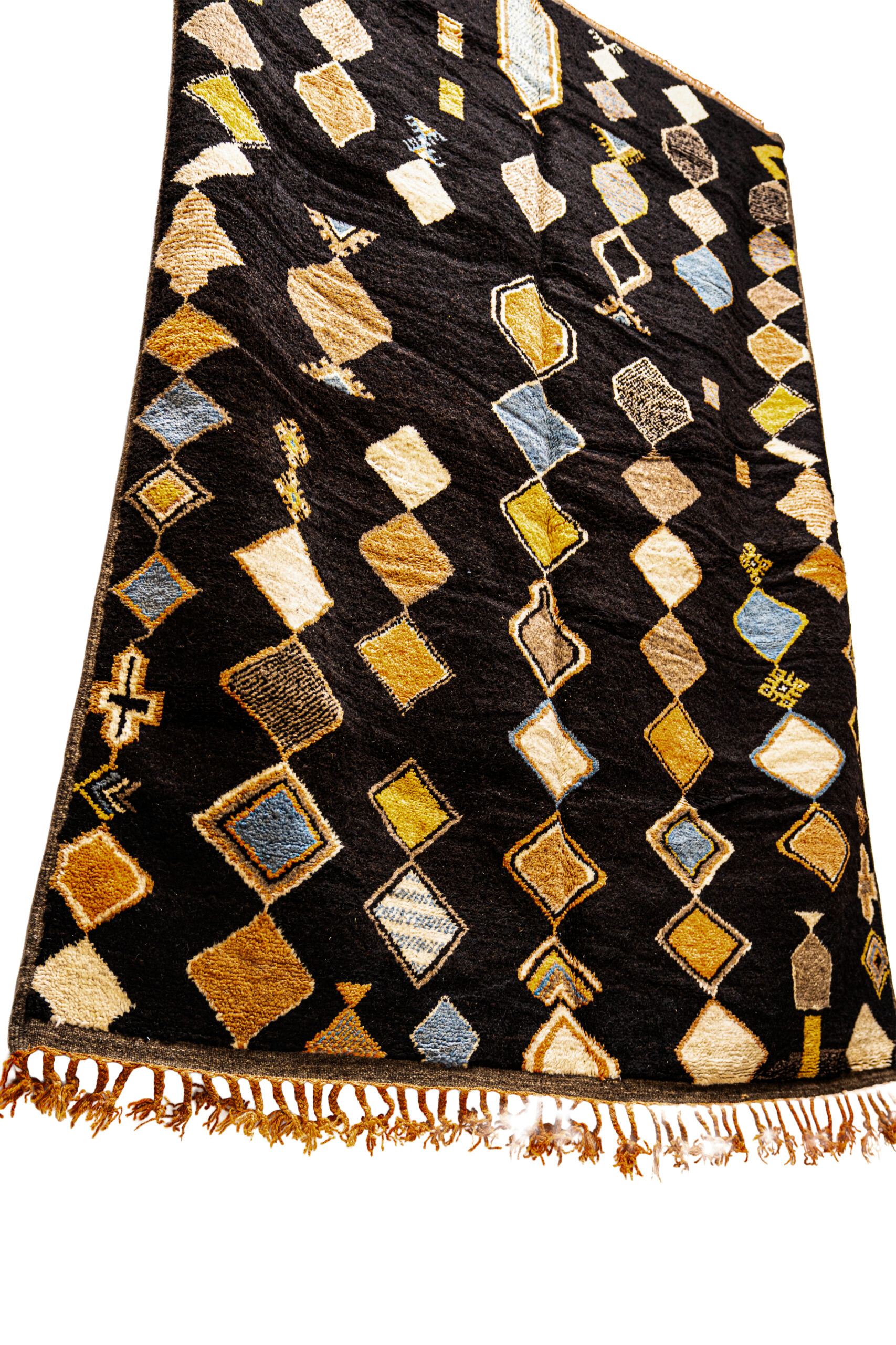 This hand-knotted rug is a masterpiece of contemporary Berber weaving, a unique expression of the artistic freedom characteristic of the Azilal region. The use of a black/deep brown field is less common than the typical cream, giving the rug a modern, graphic intensity.