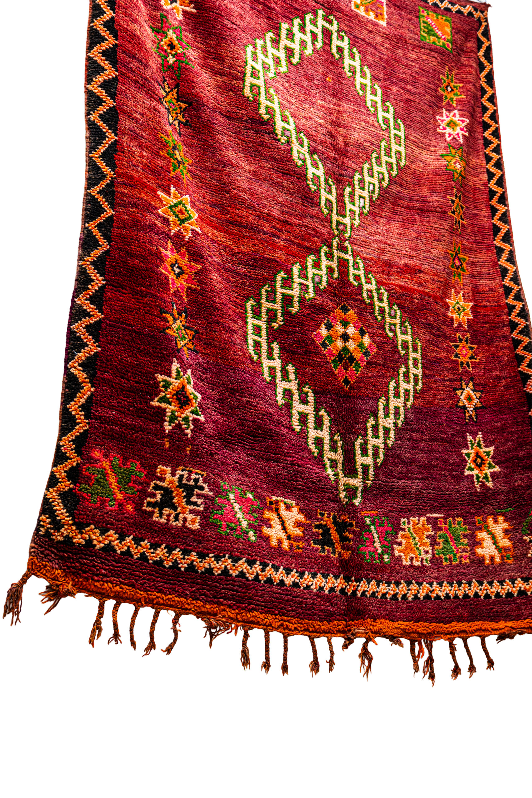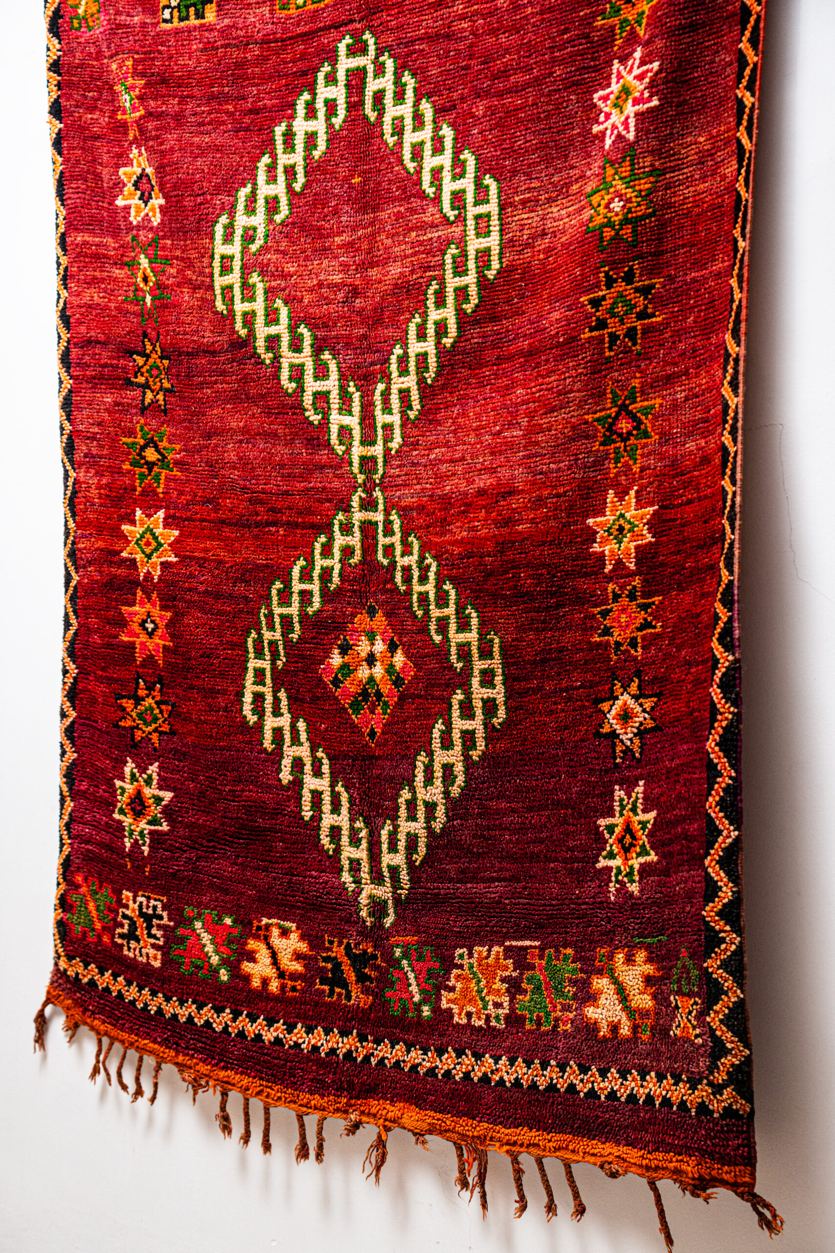 - Dominant Color: The field is a dense, high-to-medium pile of variegated crimson or deep ruby red wool, which shows a beautiful abrash (color variation) characteristic of natural dyes. Red symbolizes life, power, and protection in Berber culture.