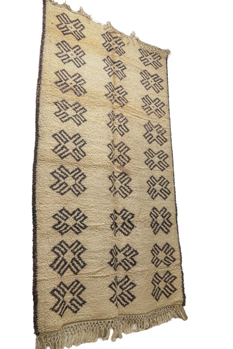 Add a touch of grandeur to your hallway or living space with this impressive authentic Moroccan runner, identified as Article 134 from the Nadia el Yassini collection. Hand-knotted from plush natural wool, the design features a striking array of repeating geometric “X” or cross symbols arranged in two vertical columns against a warm cream background.