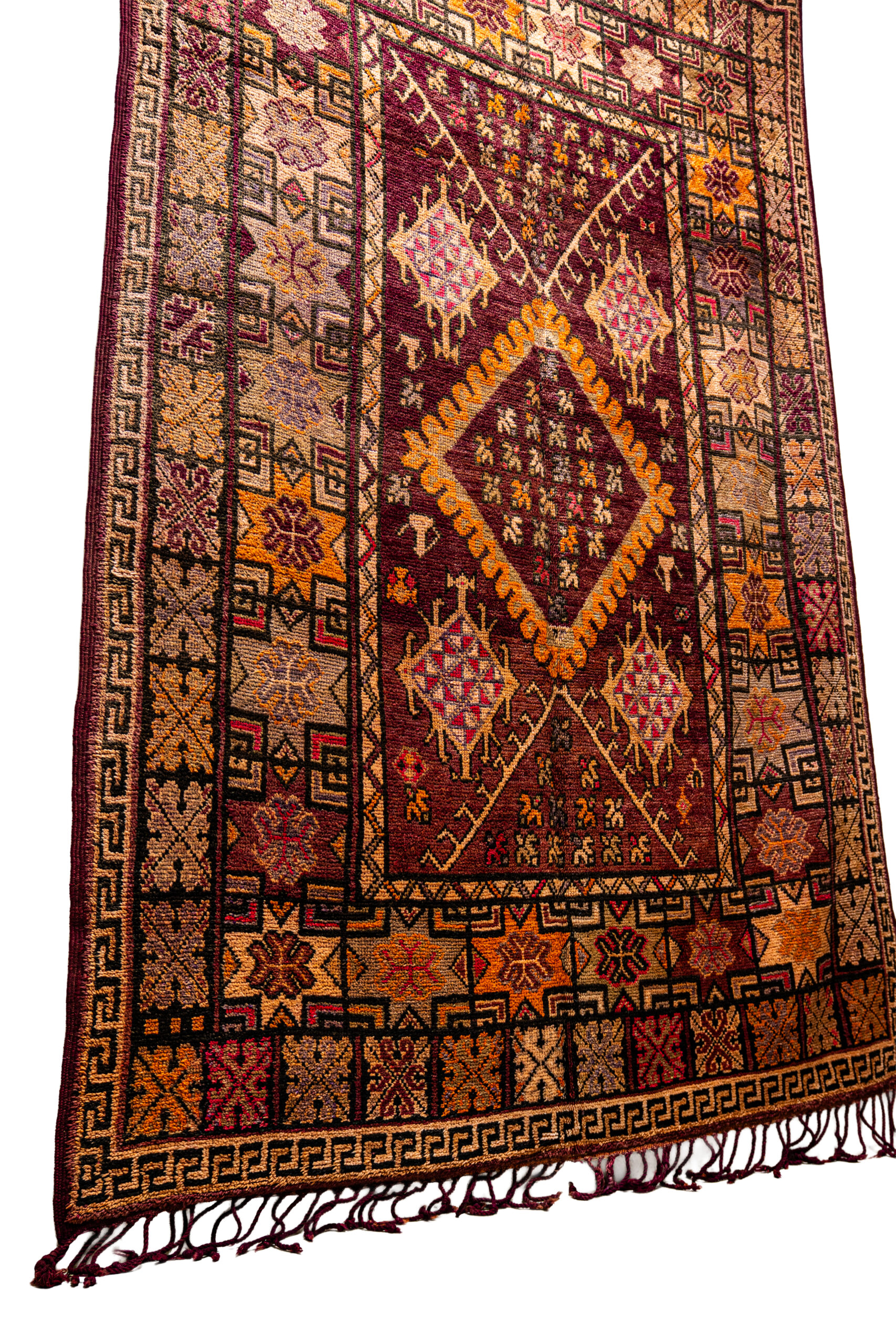 - Dominant Colors: The field is an intense, variegated deep crimson/burgundy, likely achieved with natural madder dyes, which has oxidized over time to create beautiful color abrash. Strong accents of saffron yellow, peach/orange, black, and vivid pink are incorporated into the pattern.