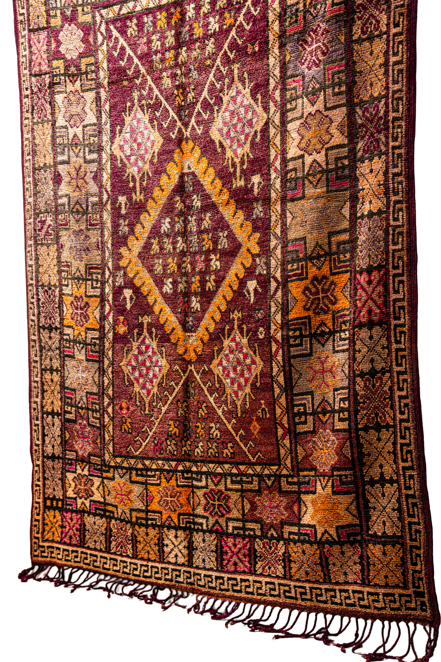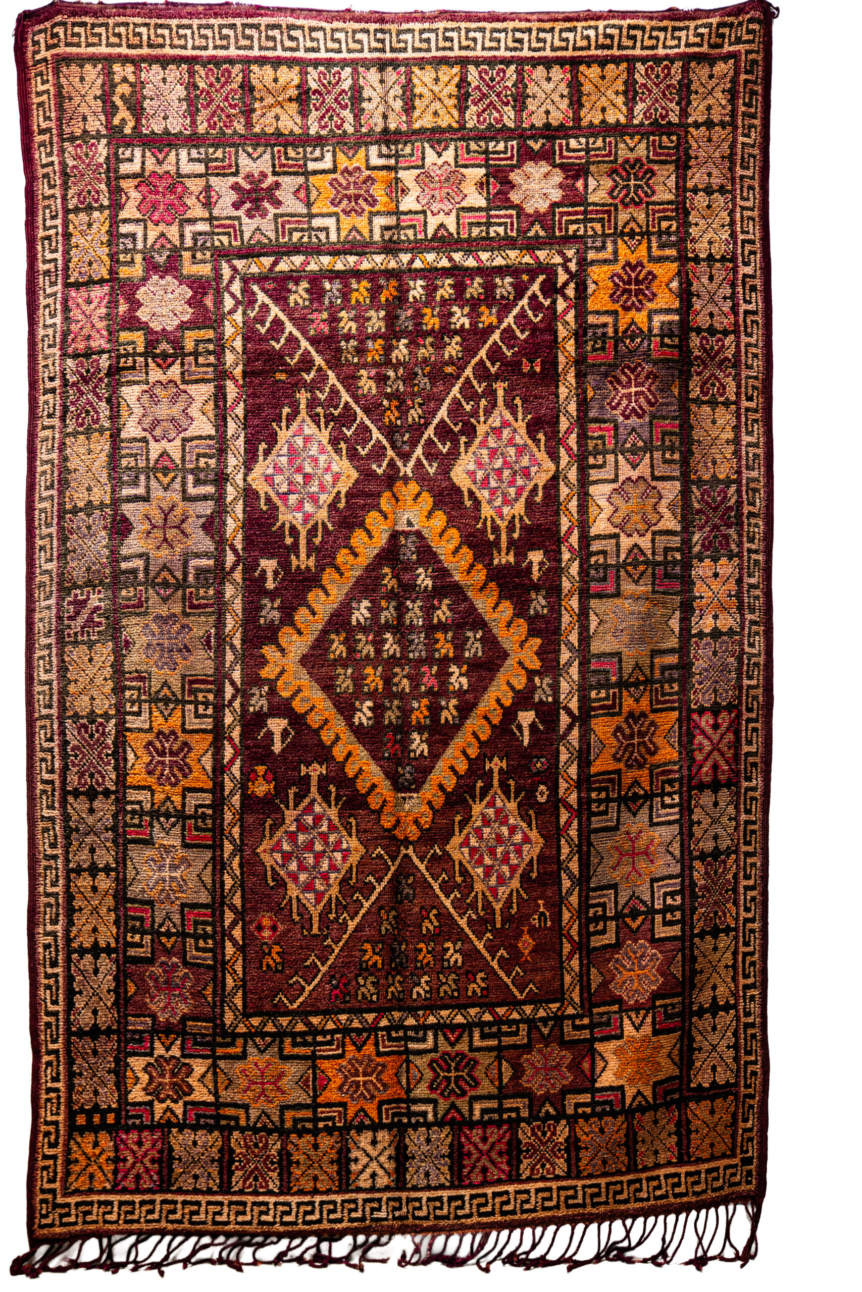 - Design: The rug features a large, stacked diamond medallion at its center, surrounded by a tight grid of smaller repeating geometric motifs (crosses, eight-pointed stars, and lozenges). The border is wide and complex, filled with geometric patterns (possibly Greek key or interlocking shapes), which frames the intense central design.
