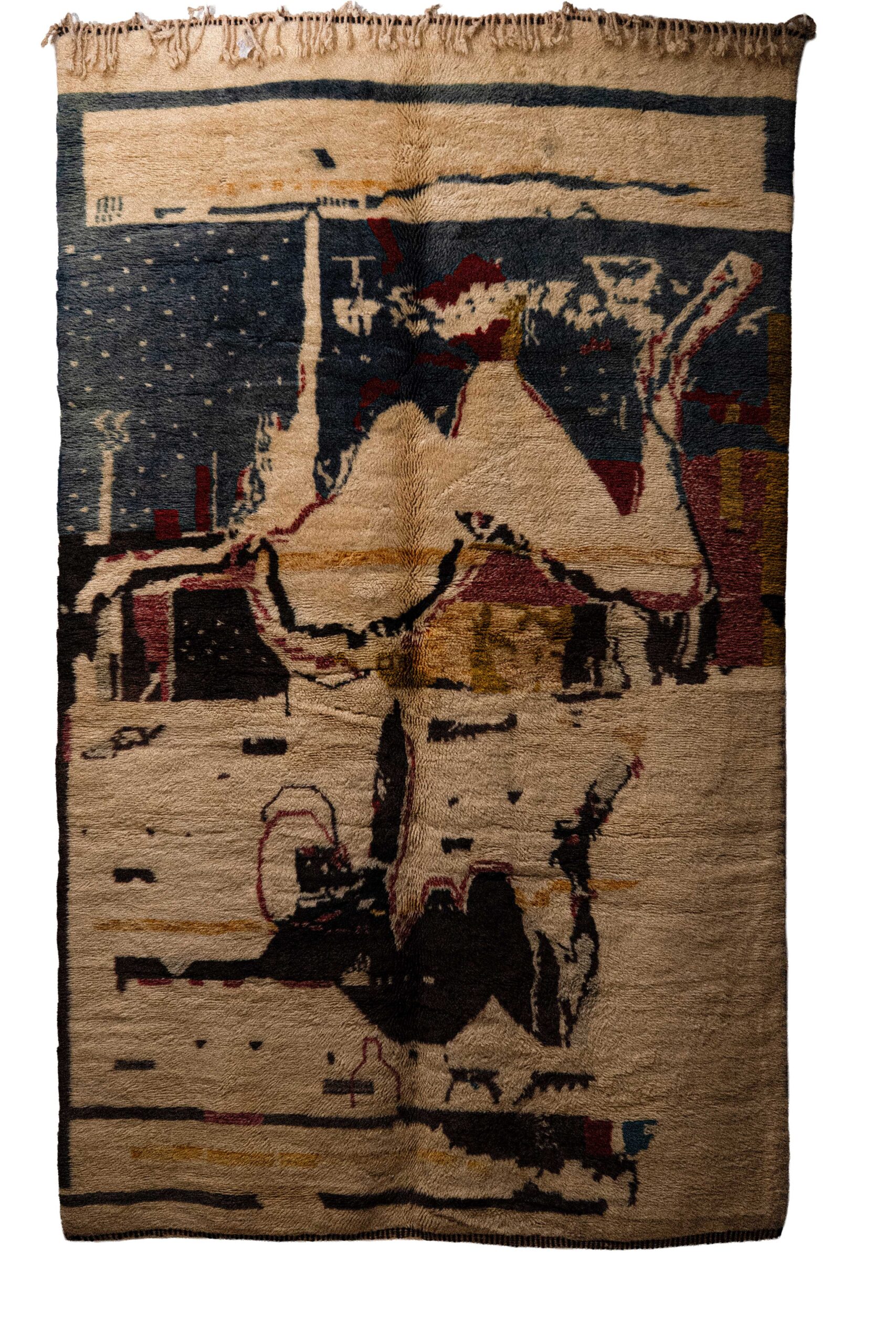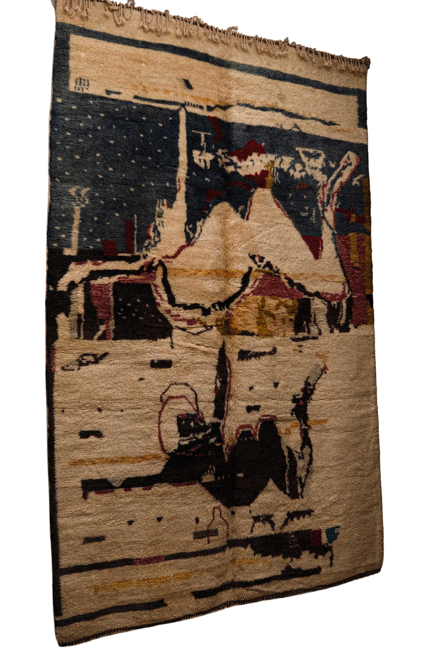 This extraordinary pile rug is a rare and collectible masterpiece of Azilal craftsmanship from the High Atlas mountains of Morocco. Unlike traditional geometric Berber rugs, this piece is a woven canvas, presenting a captivating pictorial narrative that borders on surrealist art. The composition features a dramatic “night scene” at the top, where a deep indigo blue field is scattered with white knots resembling a starry sky. Below this celestial band, abstract figures—evocative of camels or caravans—traverse a landscape rendered in earthy tones of chocolate brown, maroon, ochre, and cream.
