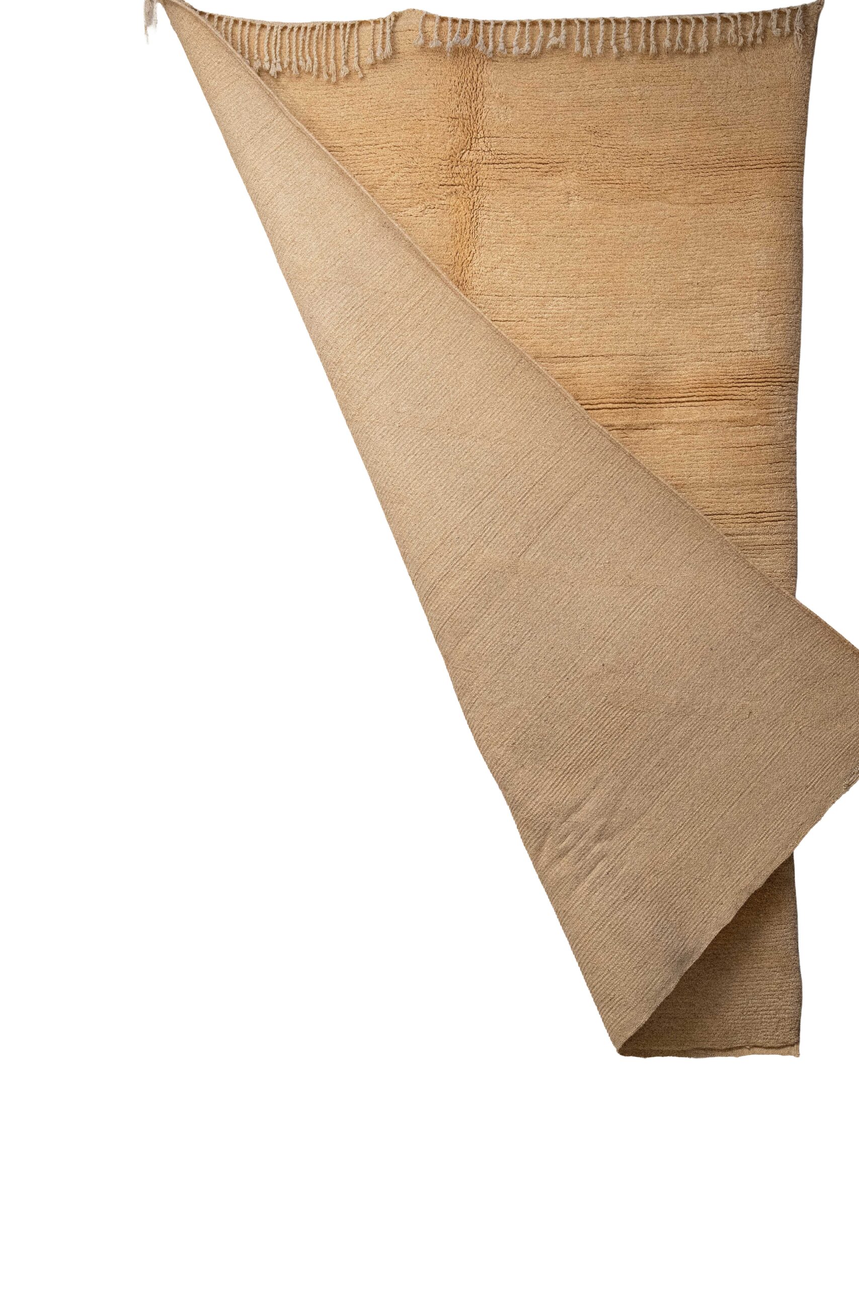 This luxurious pile rug is a prime example of the Beni Mrirt style, a highly coveted evolution of the Beni Ouarain tradition from the Middle Atlas mountains. Renowned for their exceptional density and velvety texture, Mrirt rugs are the epitome of “quiet luxury.” This piece features a solid, monochromatic field in a warm, luminous shade of golden wheat or soft apricot. Unlike patterned rugs, the beauty here lies entirely in the quality of the material and the subtle, natural variations (abrash) in the wool’s tone, which create horizontal bands of depth and light.