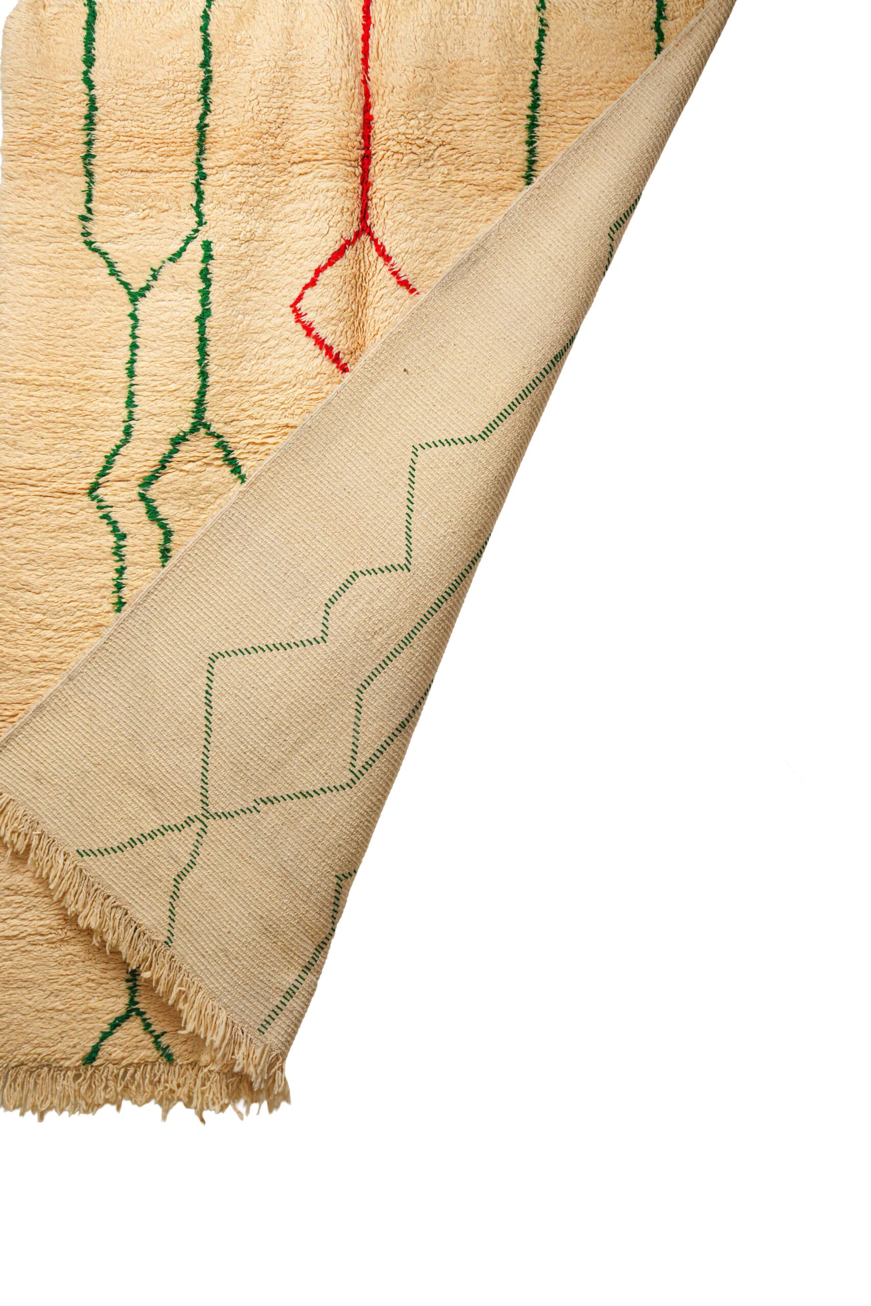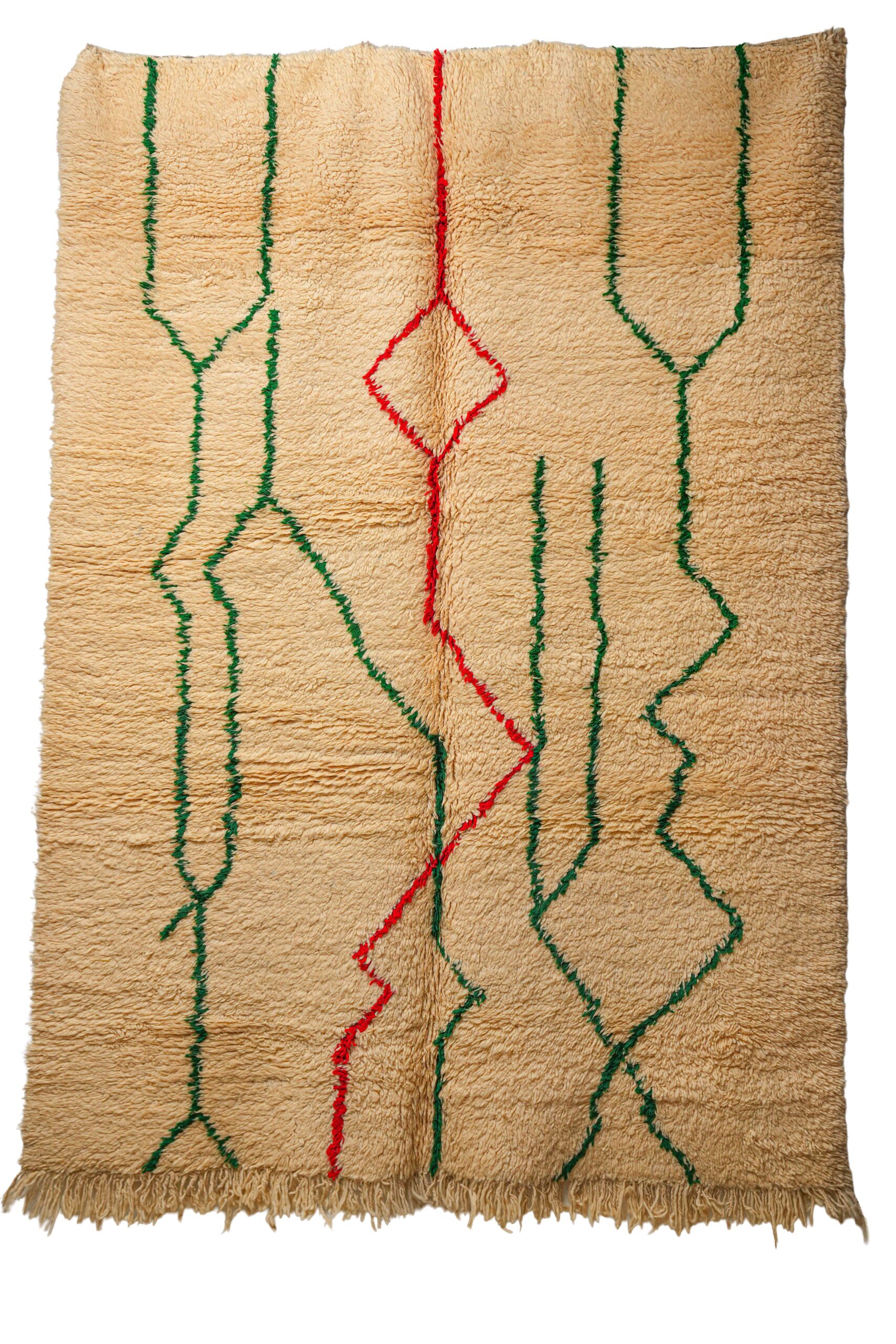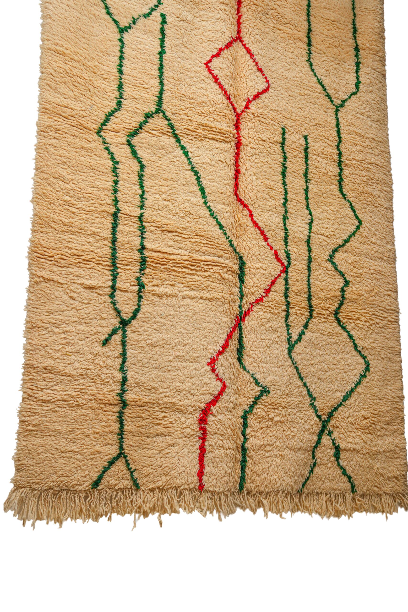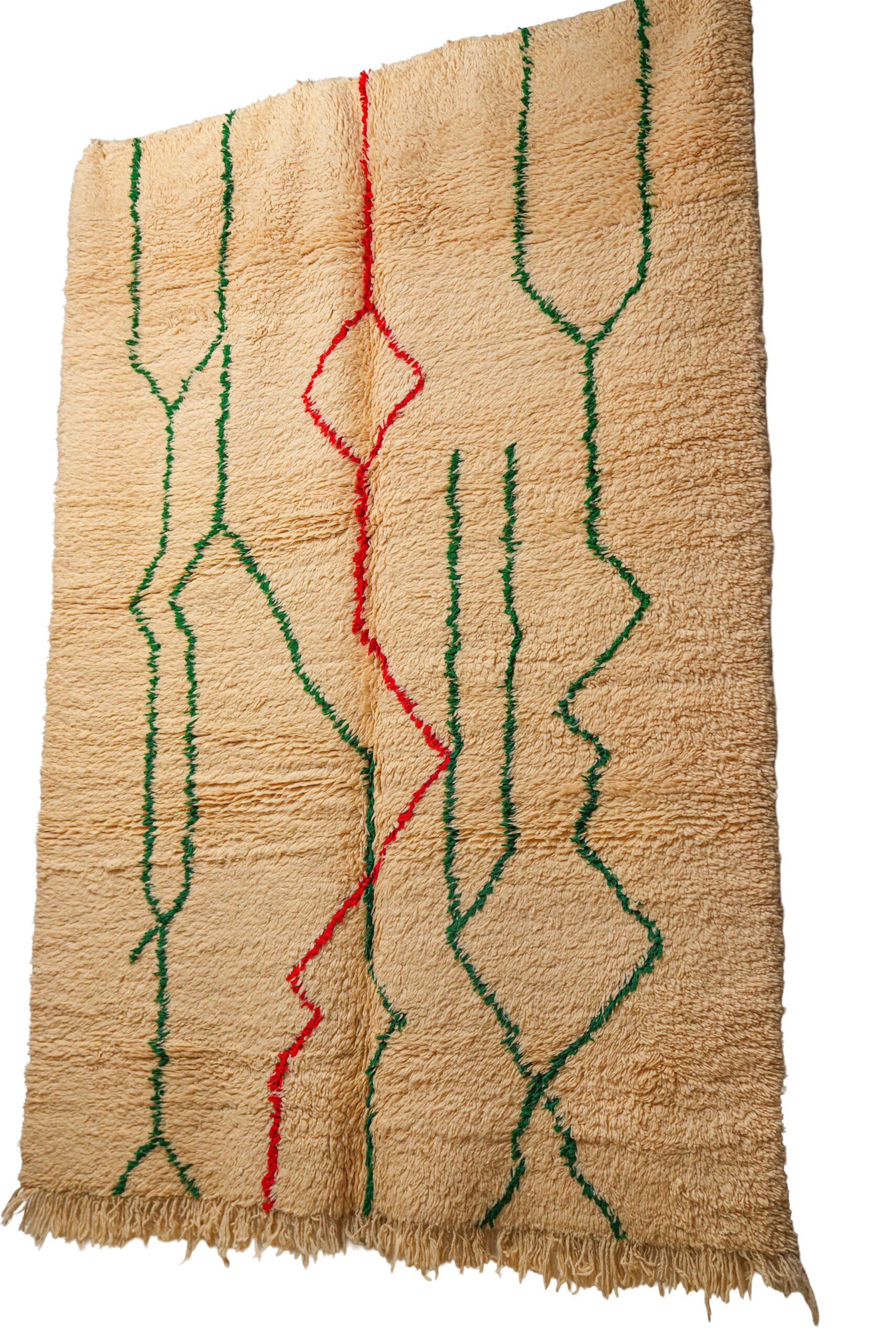 This energetic pile rug is a spirited, contemporary take on the classic Beni Ouarain style, handwoven in the Middle Atlas mountains. While it maintains the traditional foundation of thick, sandy beige natural wool, its design breaks away from the standard lattice patterns to embrace a more free-form, abstract aesthetic. The field is traversed by vertical, squiggly lines that resemble seismic waves, heartbeats, or electric currents.