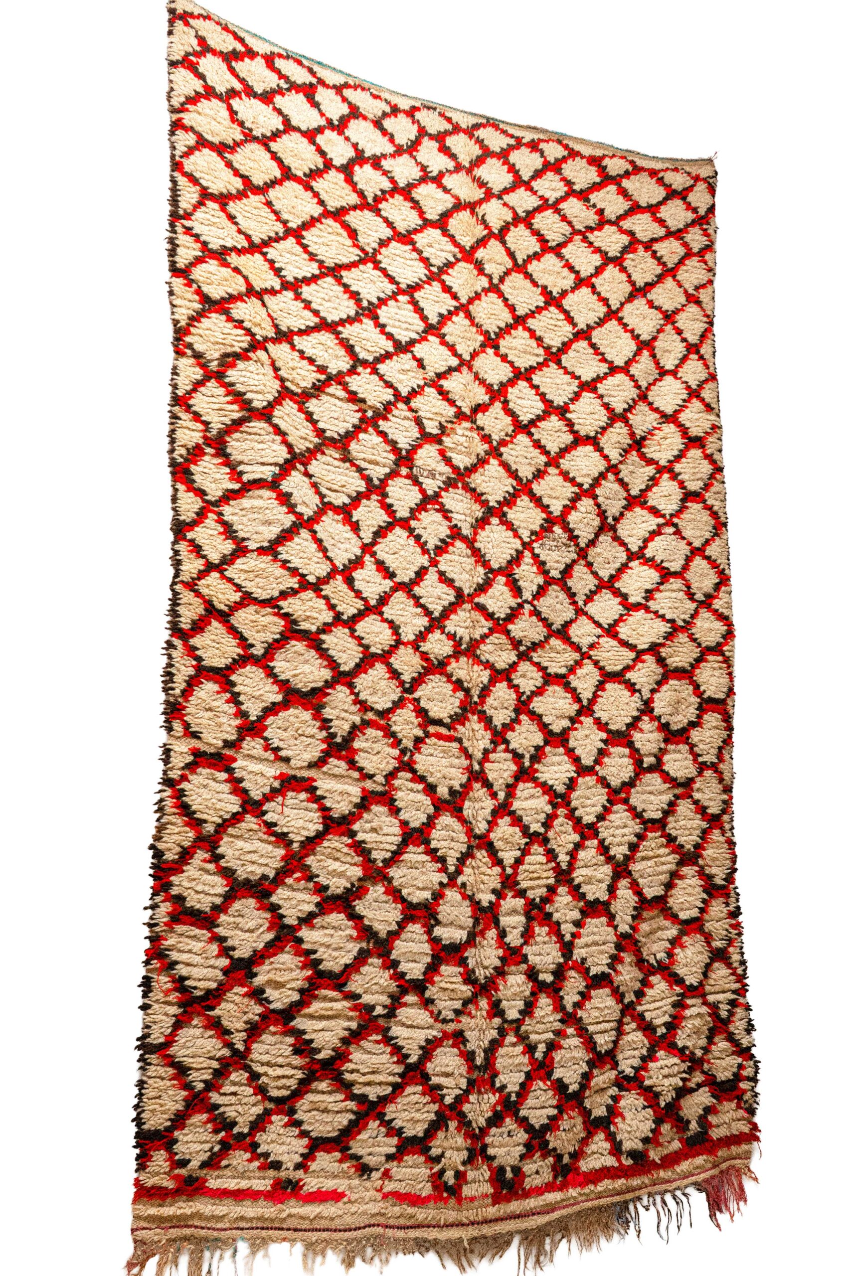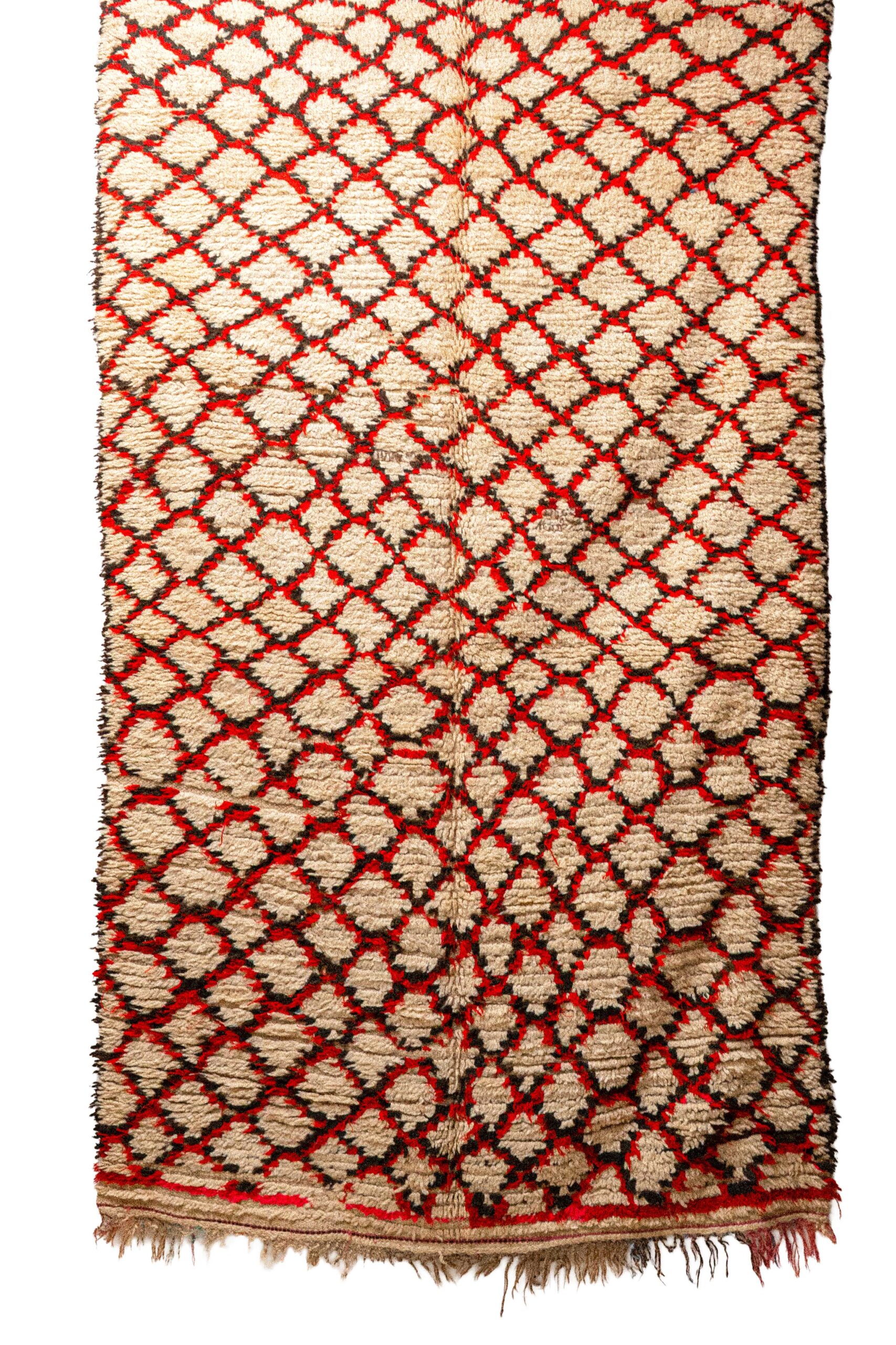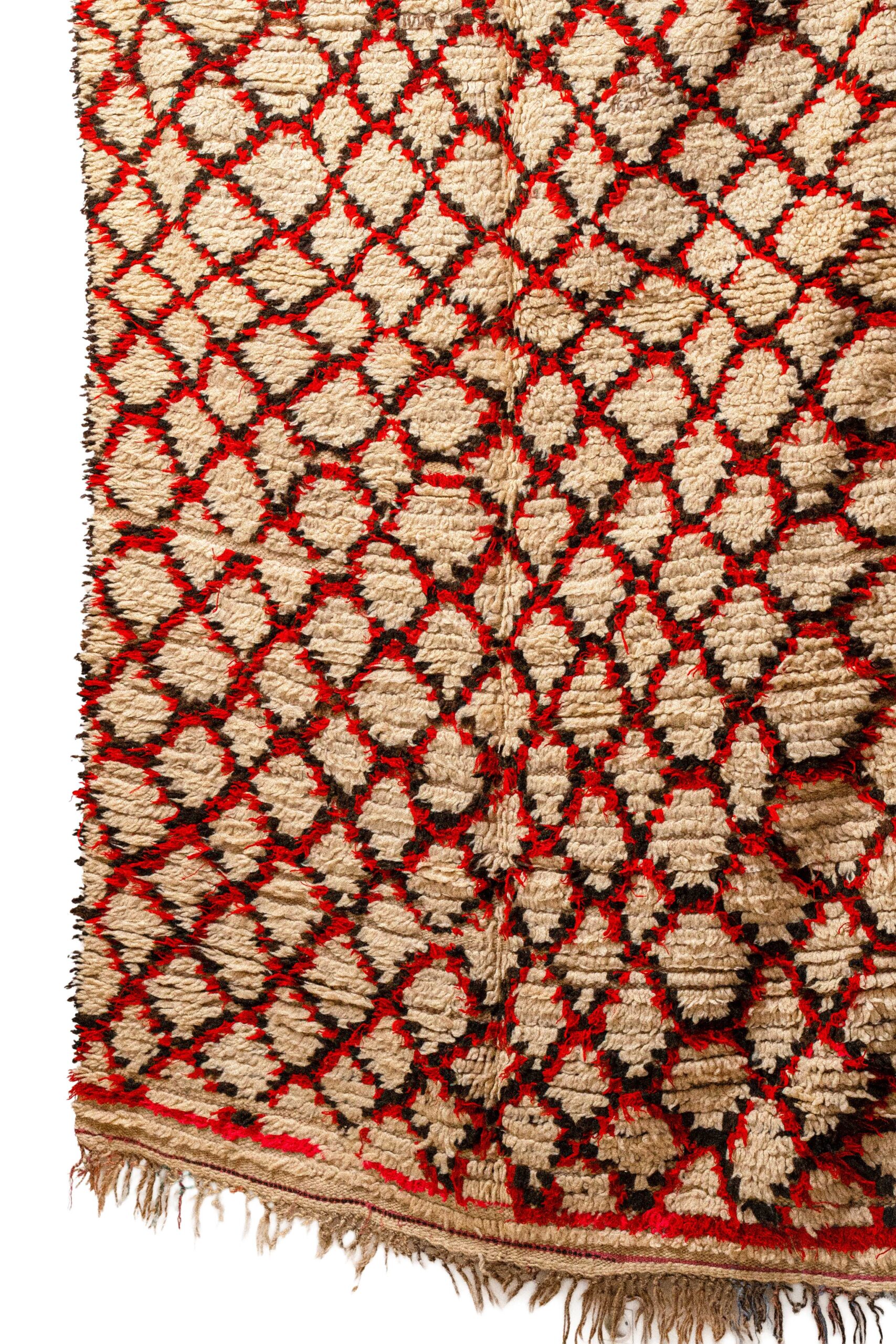 Hand-Knotted Moroccan Beni Ouarain Rug – Beige with Red & Black Honeycomb Lattice