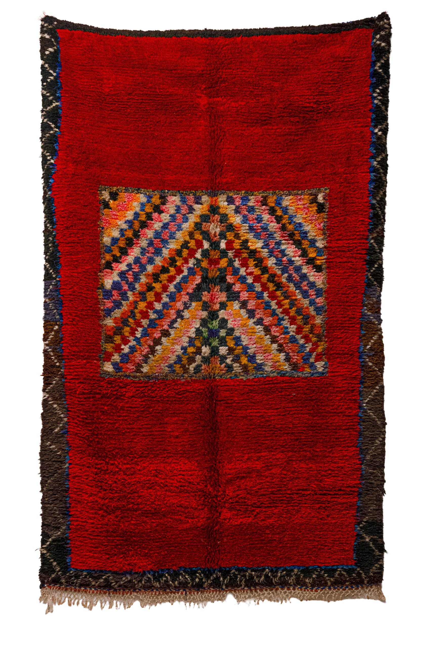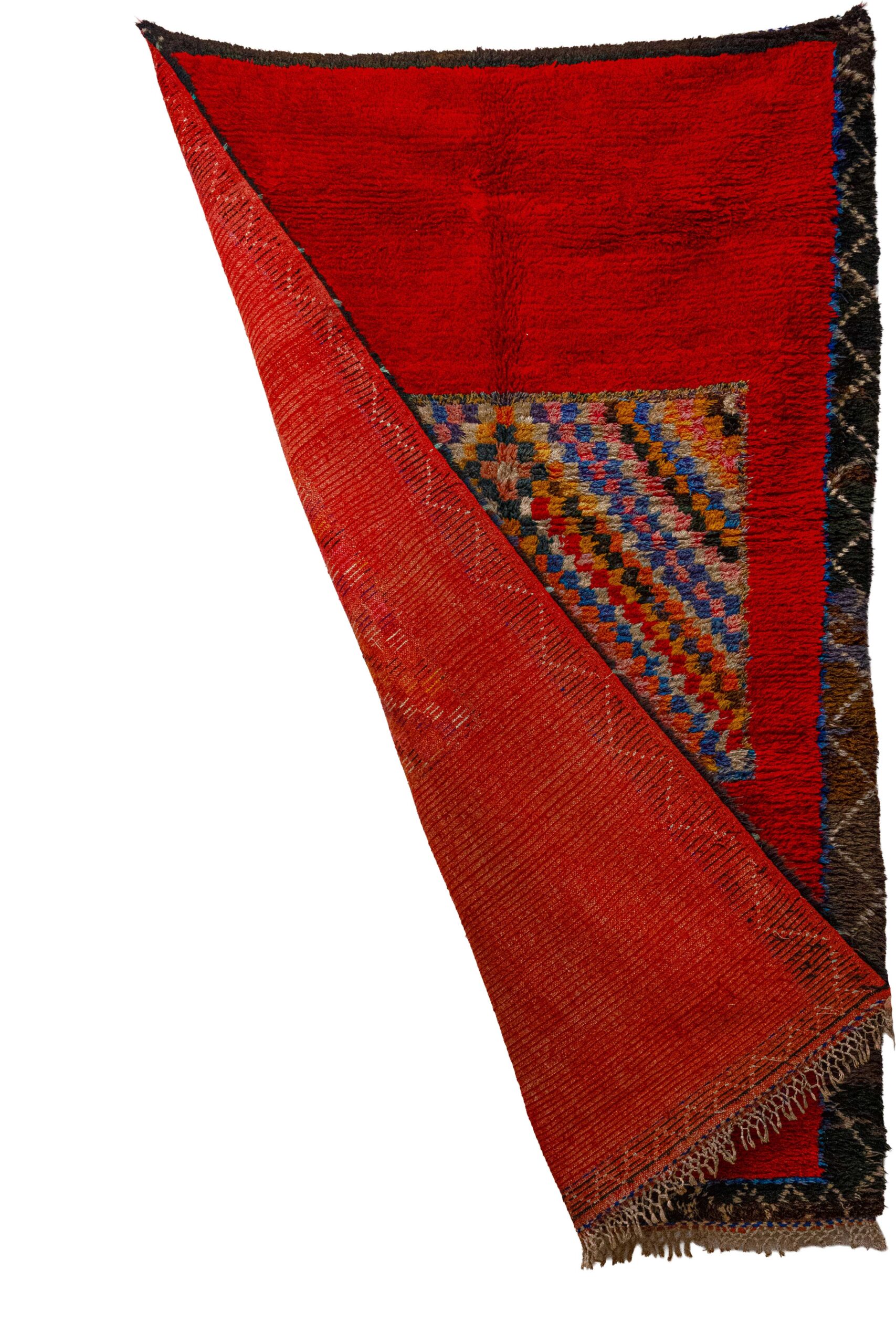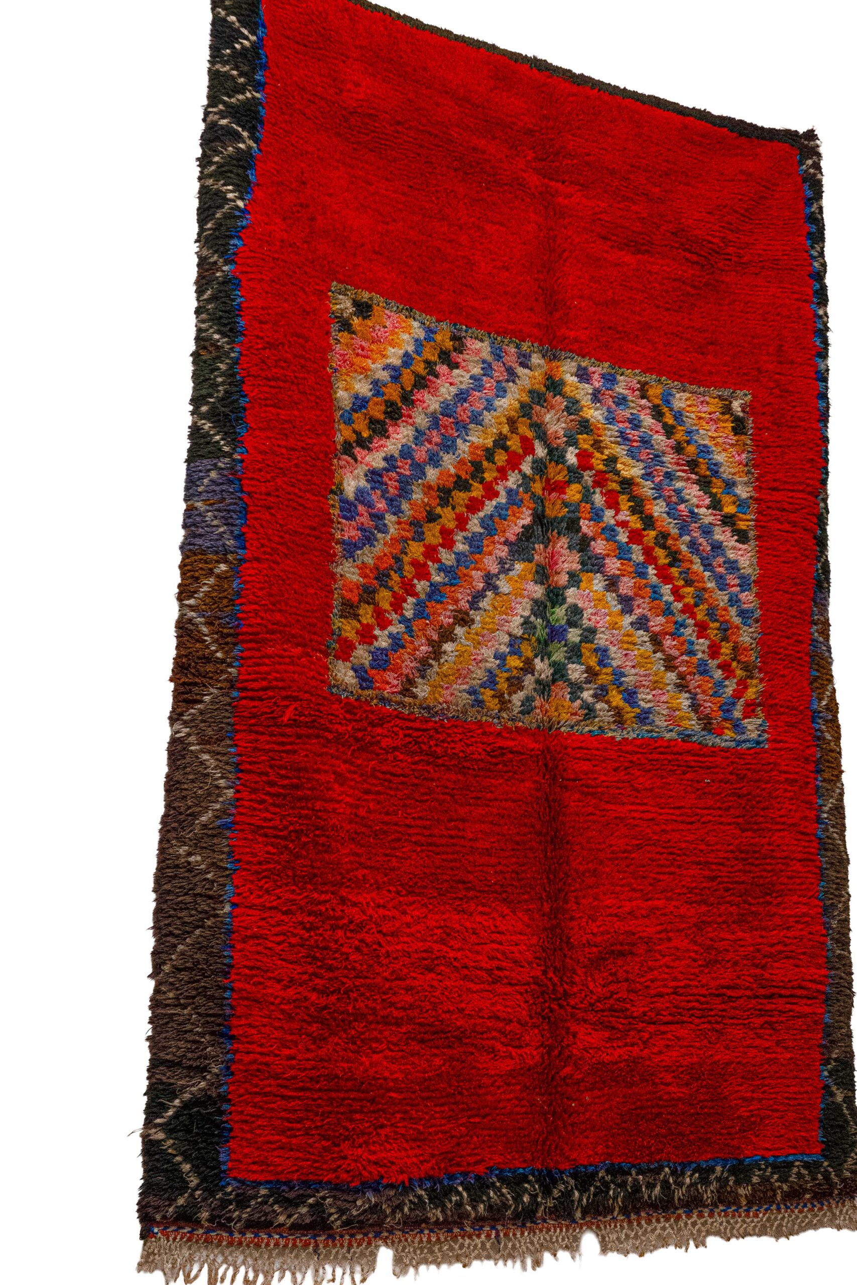 This spirited pile rug is a unique expression of Boujaad creativity, originating from the Haouz region of Morocco. While traditional Boujaad rugs are known for their warm, fading gradients, this piece makes a bold, modernist statement with a saturated, uniform crimson red field. The rug functions almost like a canvas, featuring a singular, explosive central medallion—a floating square filled with vibrant, multicolored chevrons in electric blue, saffron yellow, emerald green, and white.