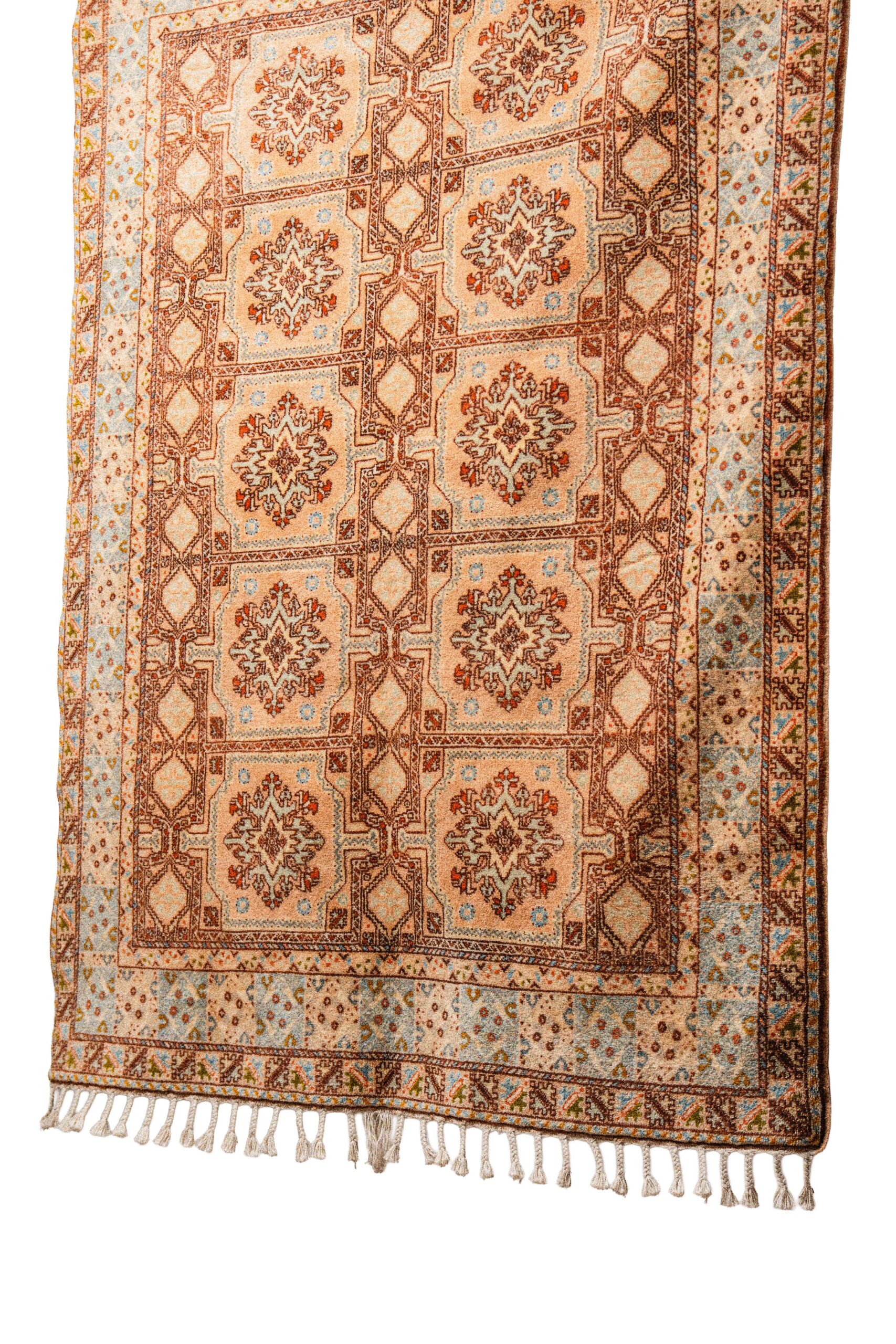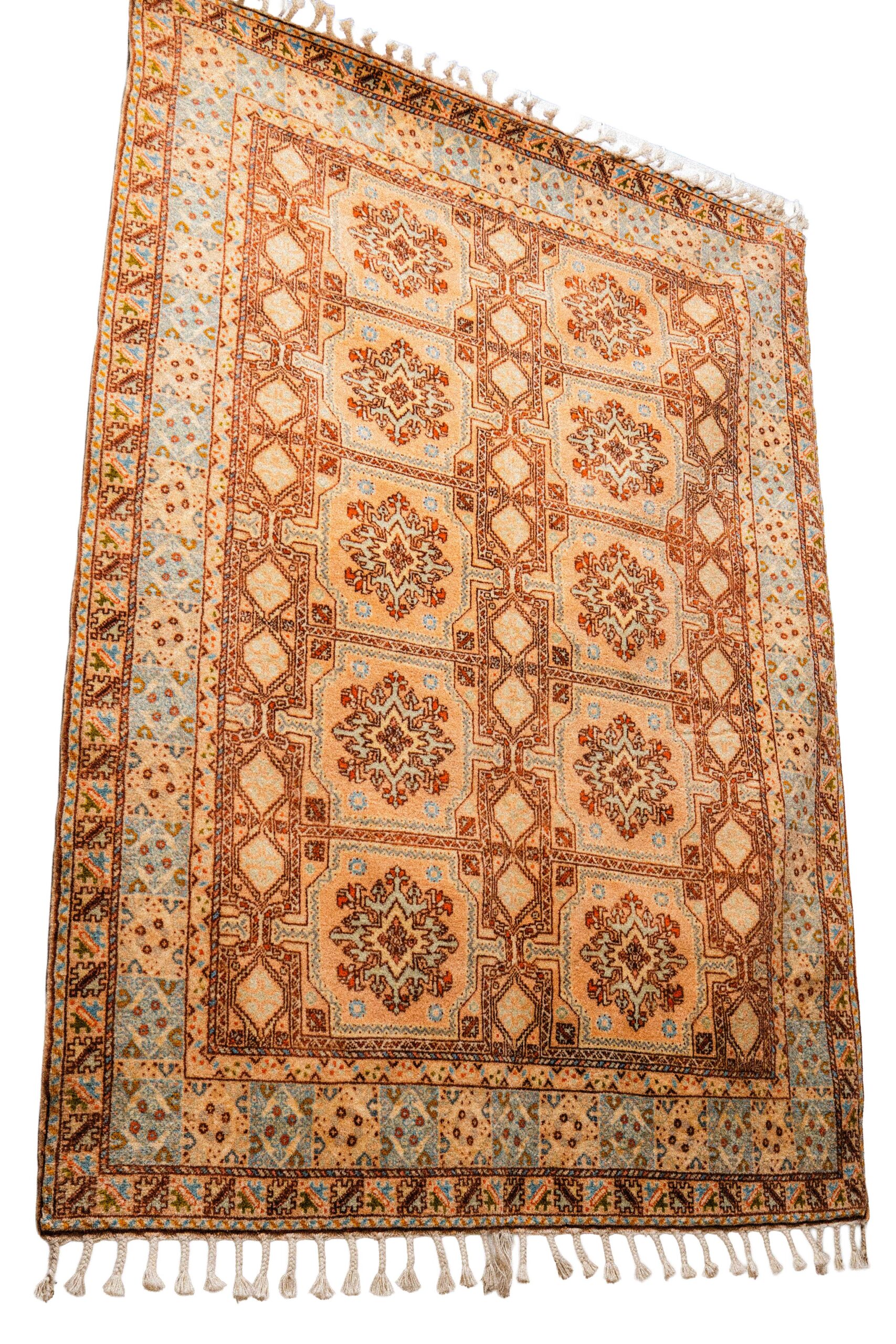 This sophisticated pile rug is a refined example of Taznakht craftsmanship, originating from the Siroua plateau in the High Atlas mountains. It stands out with its elegant, light-filled palette, featuring a soft sandy beige background that provides a neutral canvas for the warm rust and terracotta geometric composition. The design is highly organized, presenting a repeating grid of octagonal medallions, each enclosing a complex eight-pointed star or floral motif.