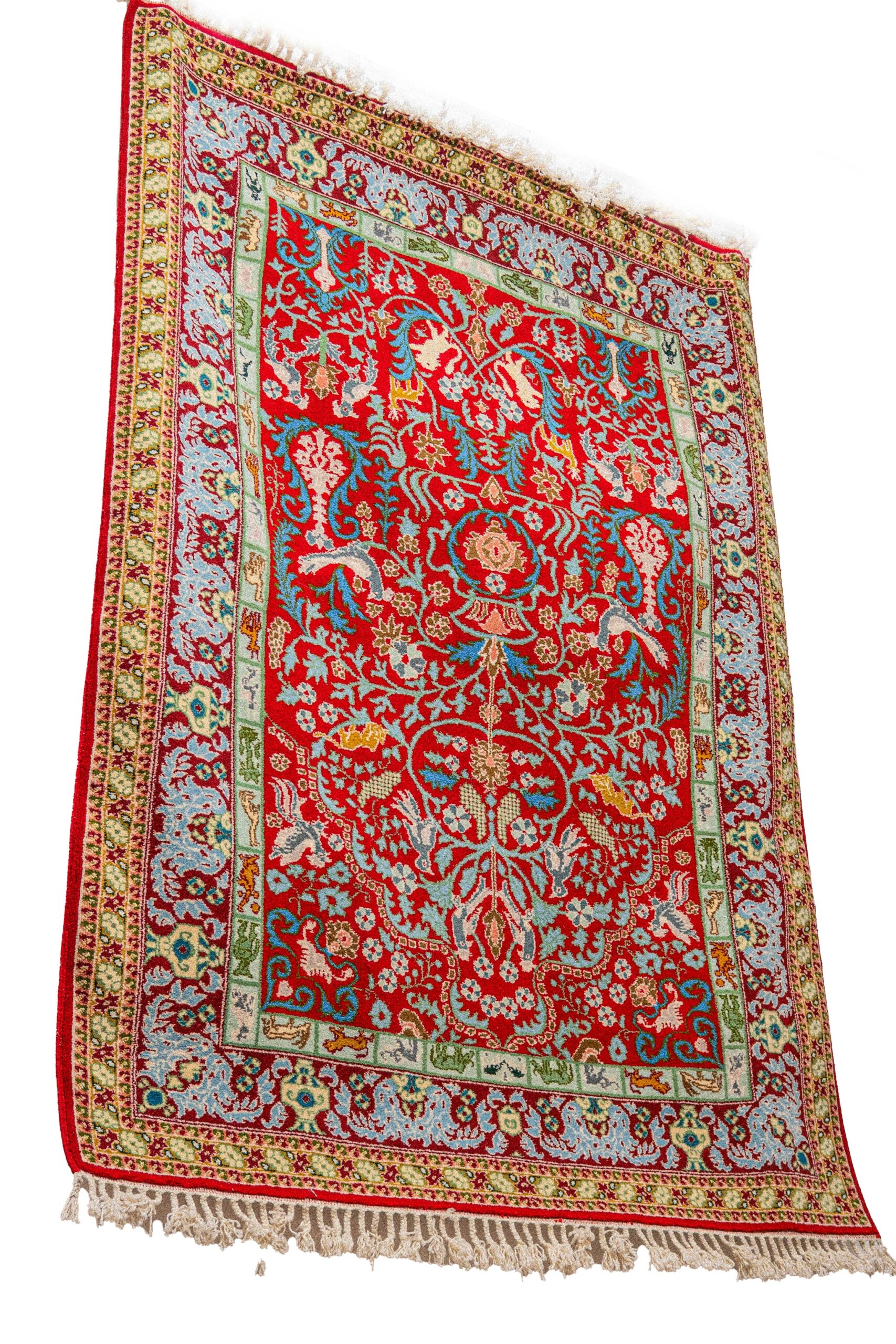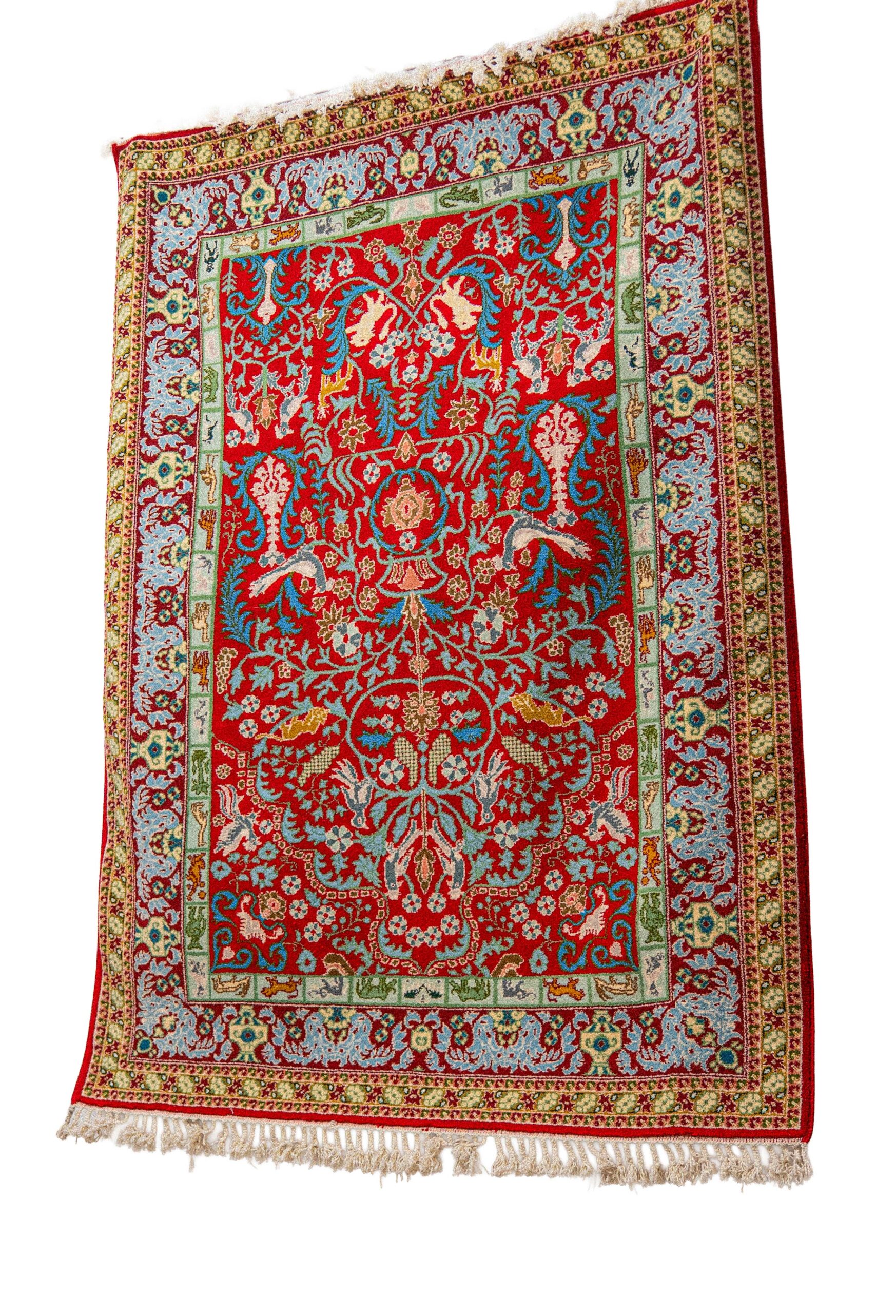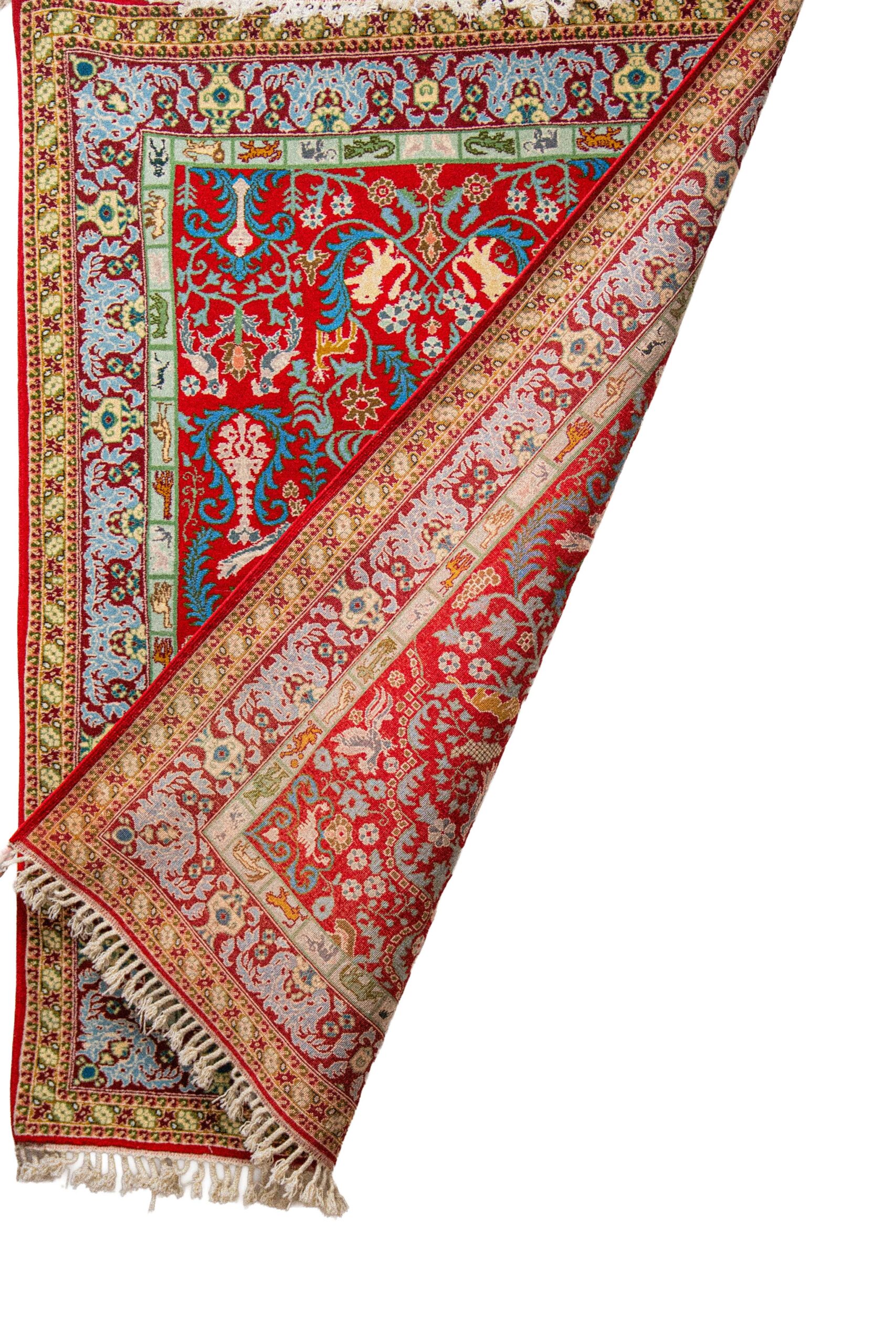 The rug is teeming with life, featuring a rich iconography of birds—resembling peacocks—and quadruped animals woven in contrasting shades of ivory, saffron yellow, and emerald green. These figures symbolize beauty, fertility, and protection. The central red field is dramatically framed by a wide, elaborate border in a striking sky blue and sage green, which is itself populated with a frieze of animals and geometric floral elements. The contrast between the deep red center and the luminous blue border creates a captivating visual depth.