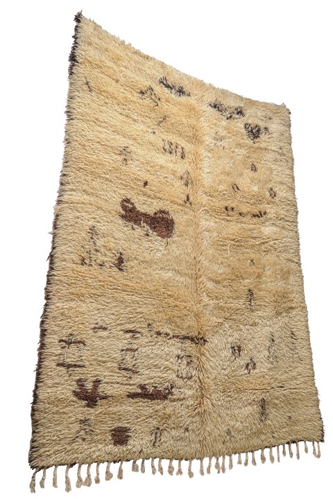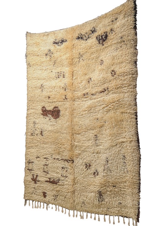 Experience the ultimate in comfort with this luxurious, authentic Moroccan Beni Ourain rug. Defined by its exceptionally deep, shaggy pile, this hand-knotted piece features a soft creamy-white foundation accented by scattered, abstract dark brown spots for an organic, minimalist look.