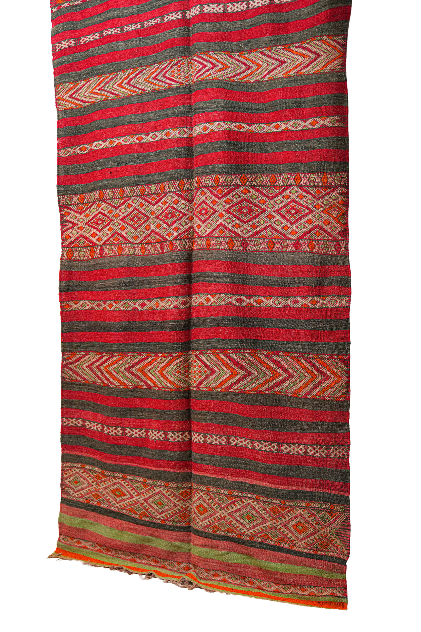 This striking flatweave rug is a vibrant example of Zanafi craftsmanship, a celebrated weaving style from the High Atlas mountains near Ouarzazate. Unlike the plush pile rugs of the north, Zanafi rugs are kilims, prized for their tight, tapestry-like construction and intricate geometric details. This piece features a bold, rhythmic composition defined by alternating horizontal bands.