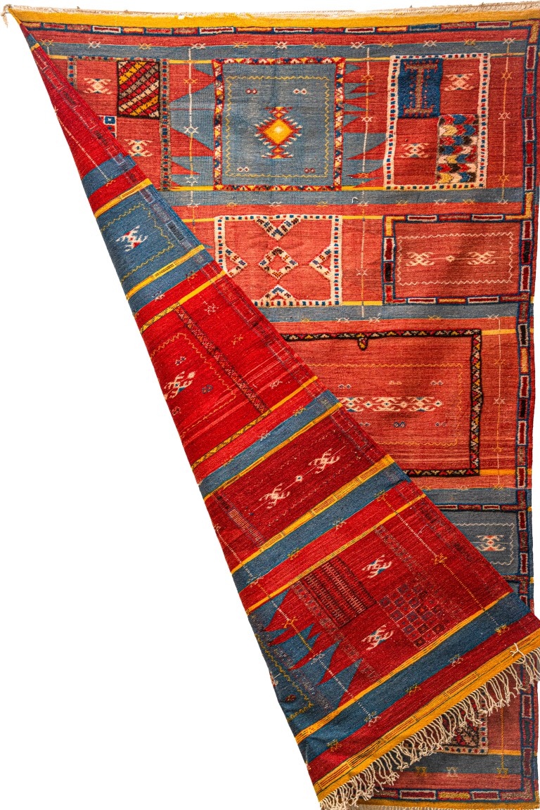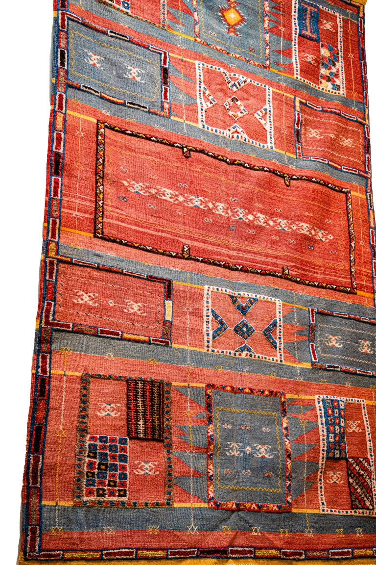 • Style and Origin: Taznakht / Glaoui (Southern High Atlas). This style is a pinnacle of Moroccan weaving, known for its “patchwork” or checkerboard layout that showcases the weaver’s entire repertoire of skills.