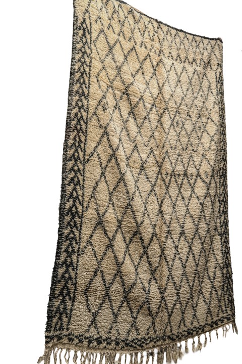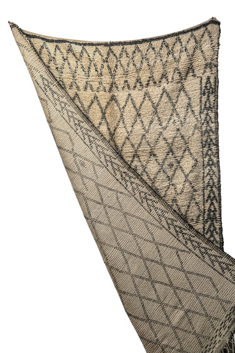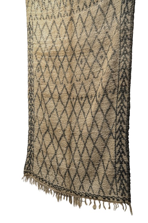 Make a sophisticated statement with this genuine Moroccan rug, distinguished by its unique “framed” design. Hand-knotted from premium natural wool, the field features a classic diamond lattice pattern, which is elegantly flanked by bold, vertical tribal borders featuring stacked zigzag motifs.