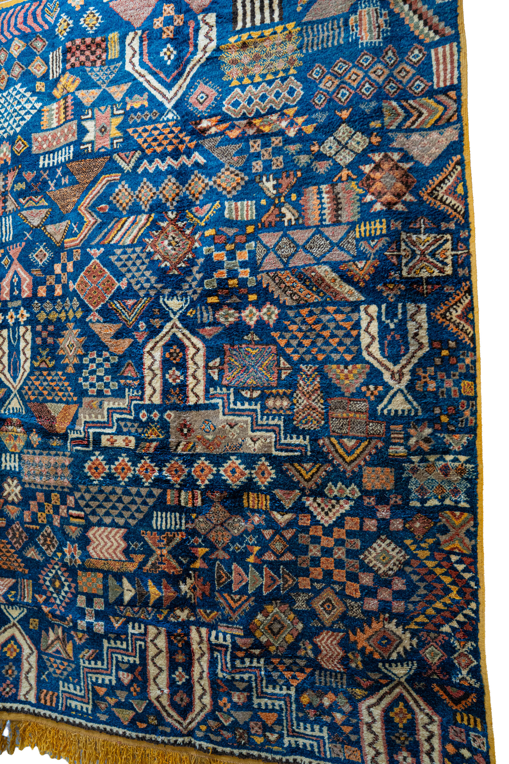 - Palette: Motifs are woven in a wide array of vibrant, naturally dyed colors, including saffron yellow, terracotta, burnt orange, red, white/cream, and lighter blues. The combination of the dark blue field with these brilliant colors is a signature of high-quality Taznakht weaving.