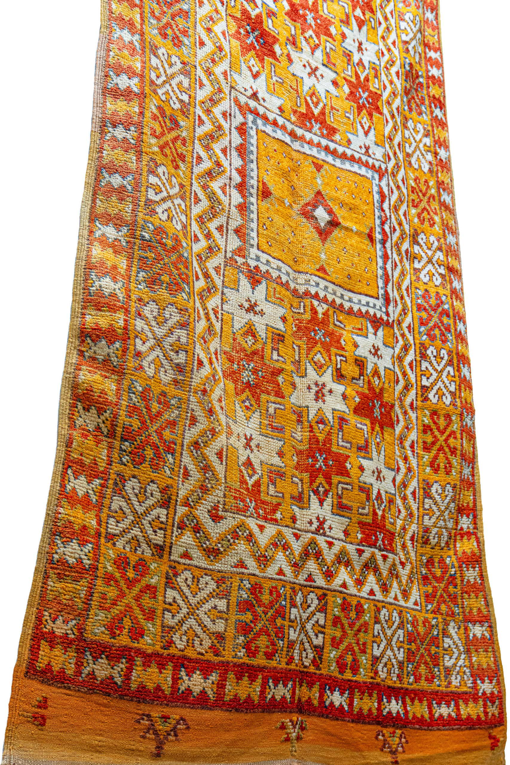 - Dominant Colors: The rug is dominated by the signature Taznakht color, a brilliant saffron yellow/orange (visible in the border and the close-up image of the weave), contrasted with deep red, black, and natural beige/brown tones. The colors within the diamonds also feature accents of sky blue and light gray.