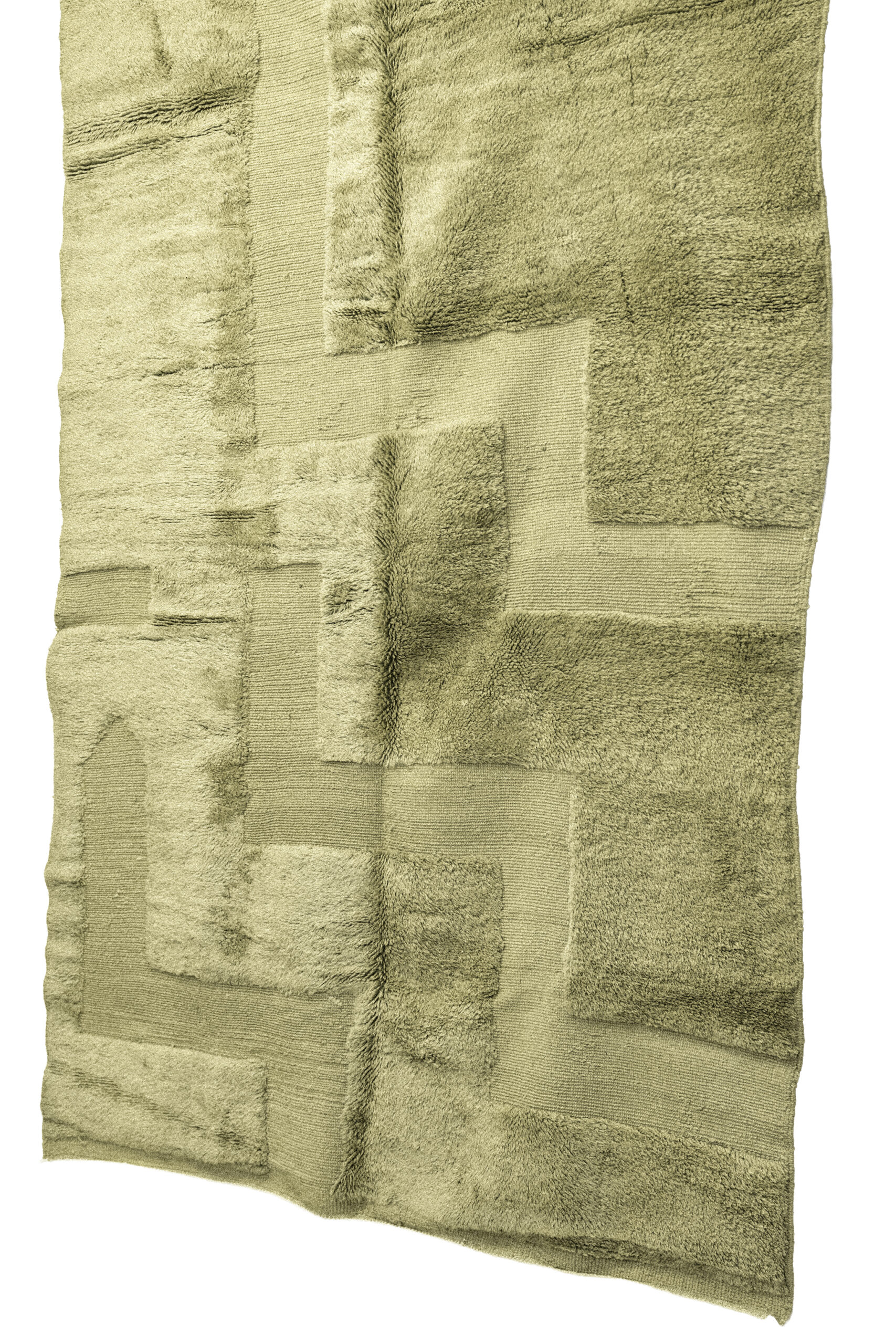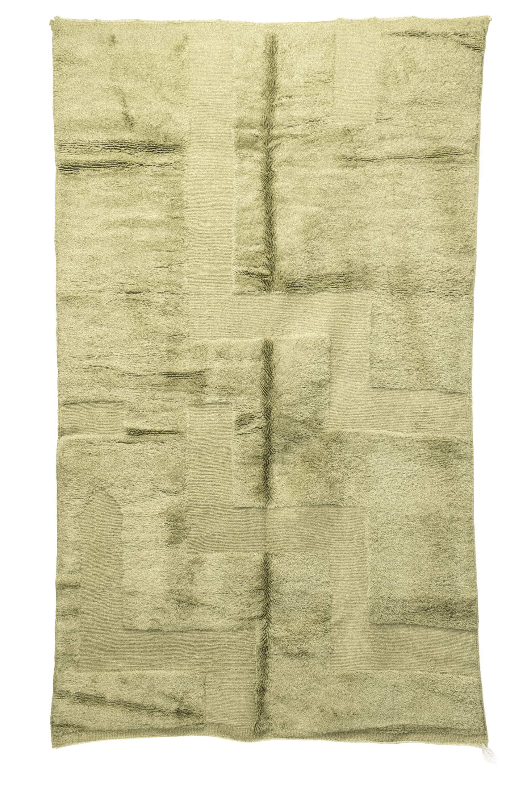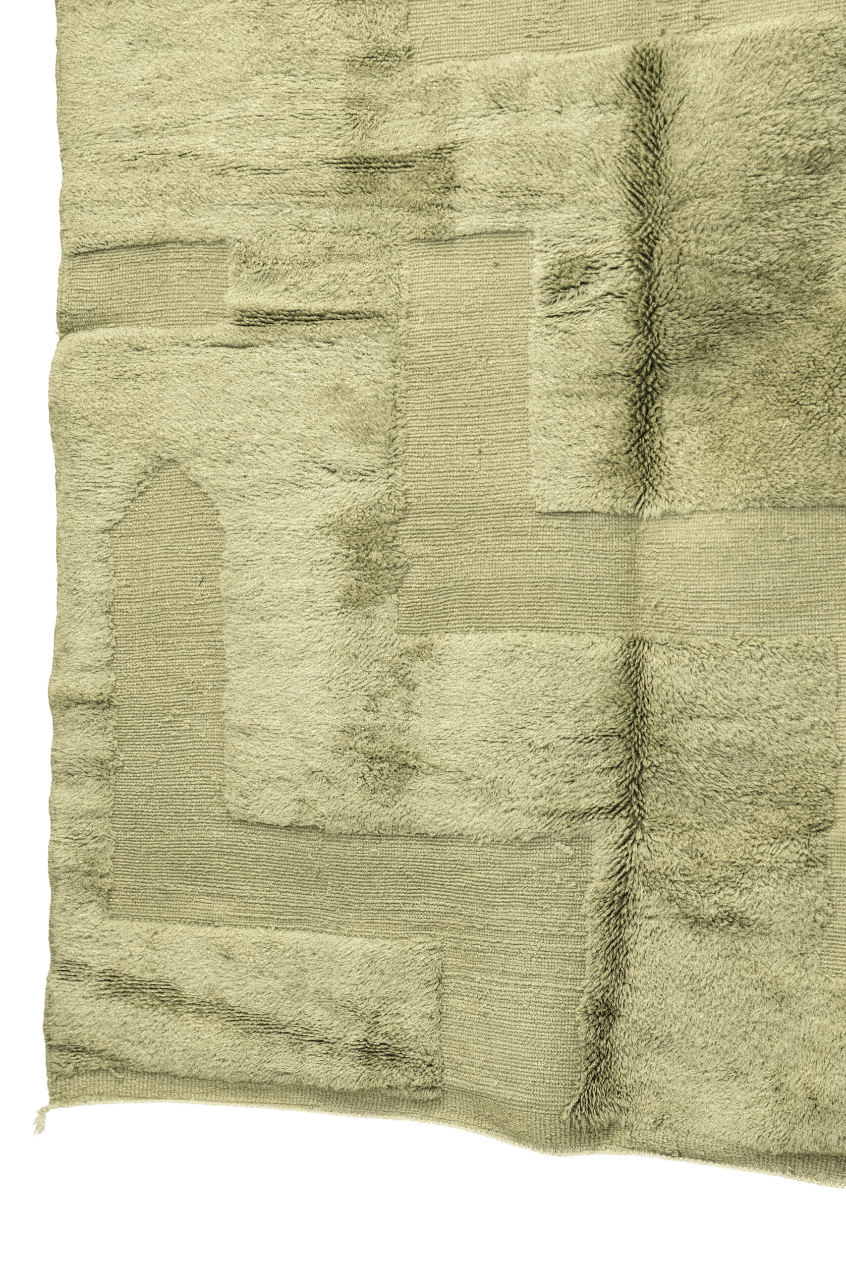 This stunning hand-woven Moroccan rug showcases a sophisticated contemporary design created through an intricate high-low weaving technique. Its soothing, earthy olive green tone brings a touch of natural, minimalist elegance to any premium interior space.