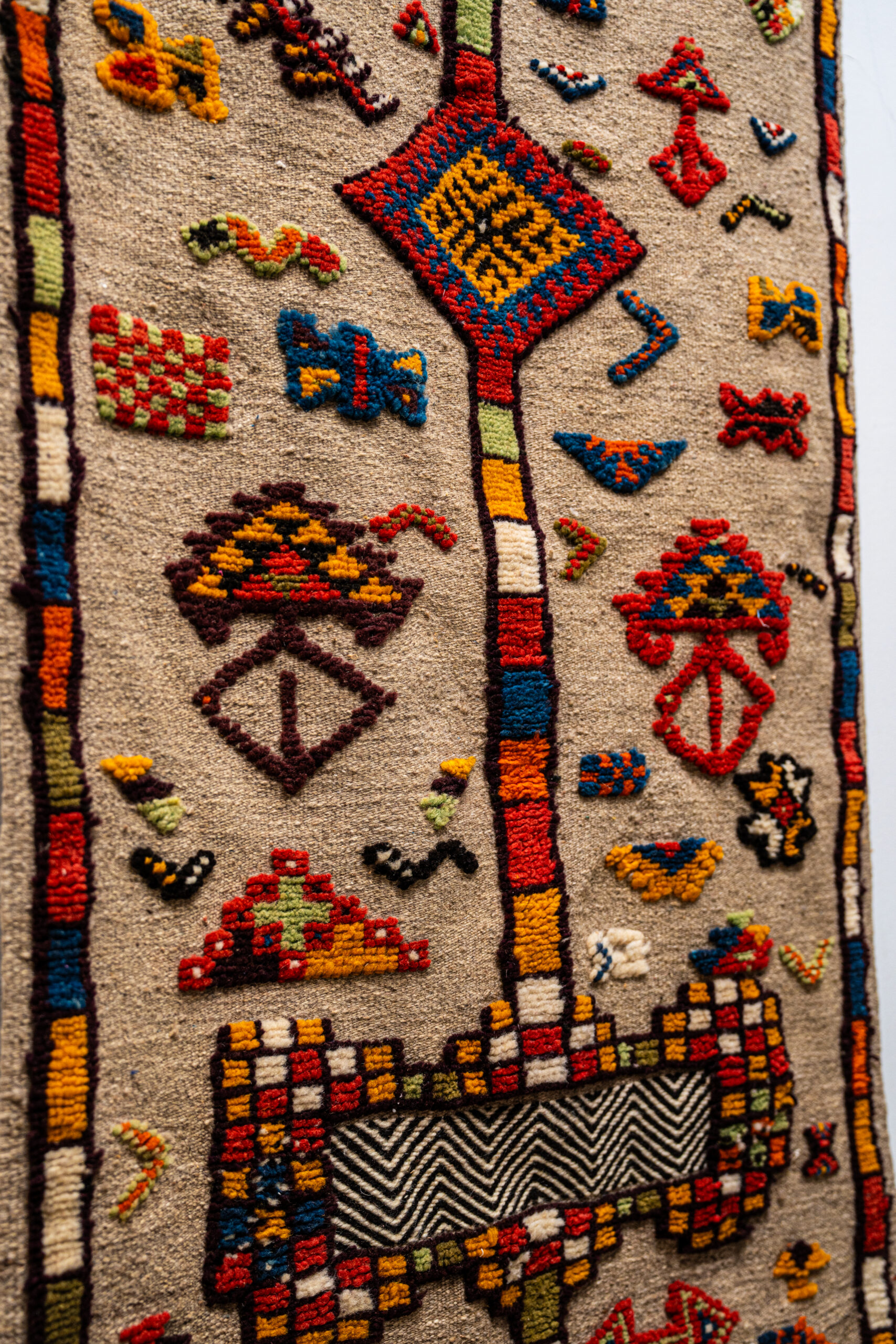 The design is dominated by a central, bold, multi-colored vertical motif, often interpreted as a “Tree of Life” or a path, connecting larger geometric elements. The numerous smaller shapes surrounding it—including diamonds, crosses, squares, and stylized natural figures—are believed to convey themes of protection, fertility, and well-being (baraka), forming a profound “writing of silence” from the female weaver.