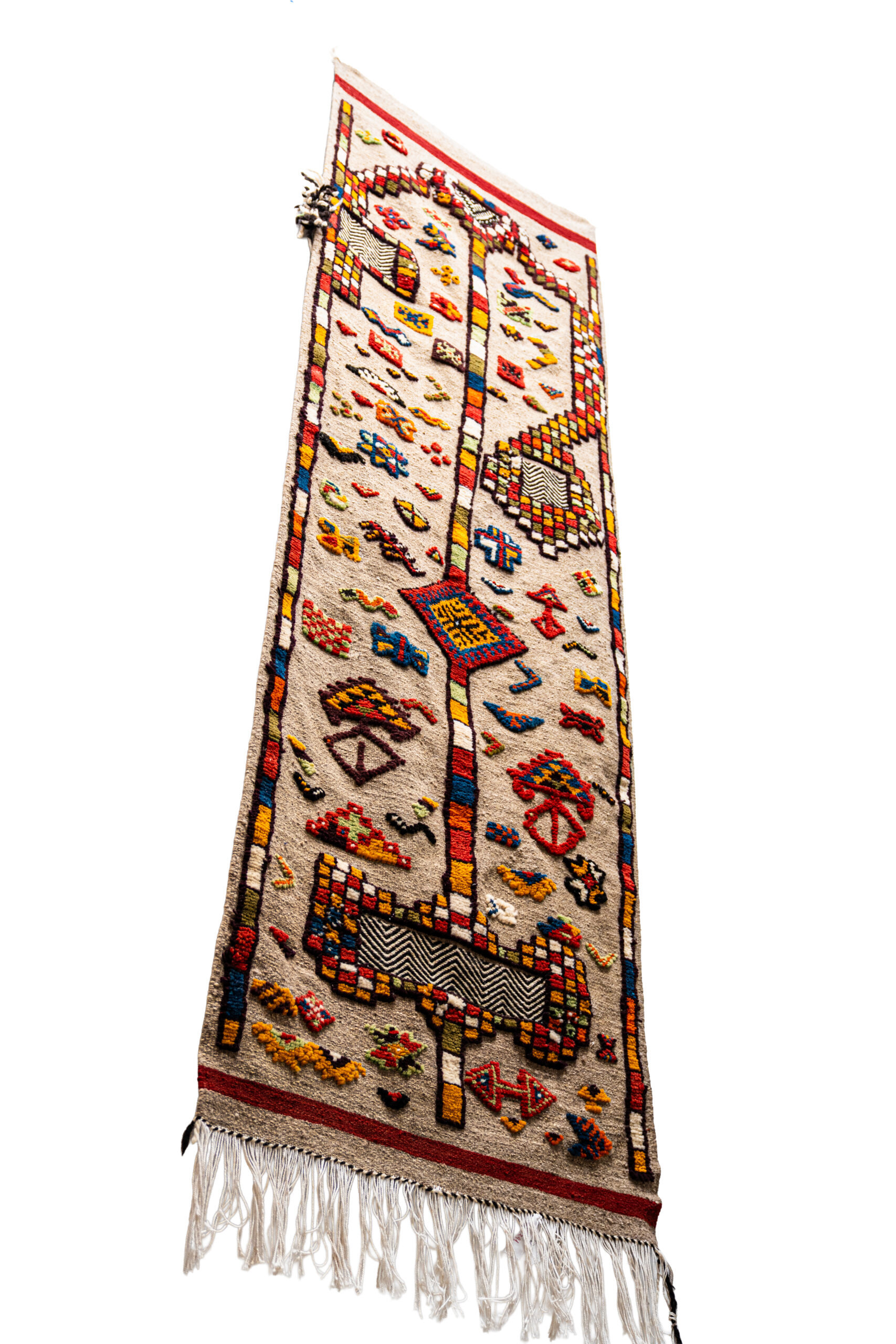 This rug is a one-of-a-kind Berber runner meticulously hand-woven in the High Atlas region of Taznakht. Unlike the heavily patterned Taznakht “patchwork” style, this piece features a natural, light-colored wool field that serves as a canvas for hundreds of vivid, individual Amazigh symbols.