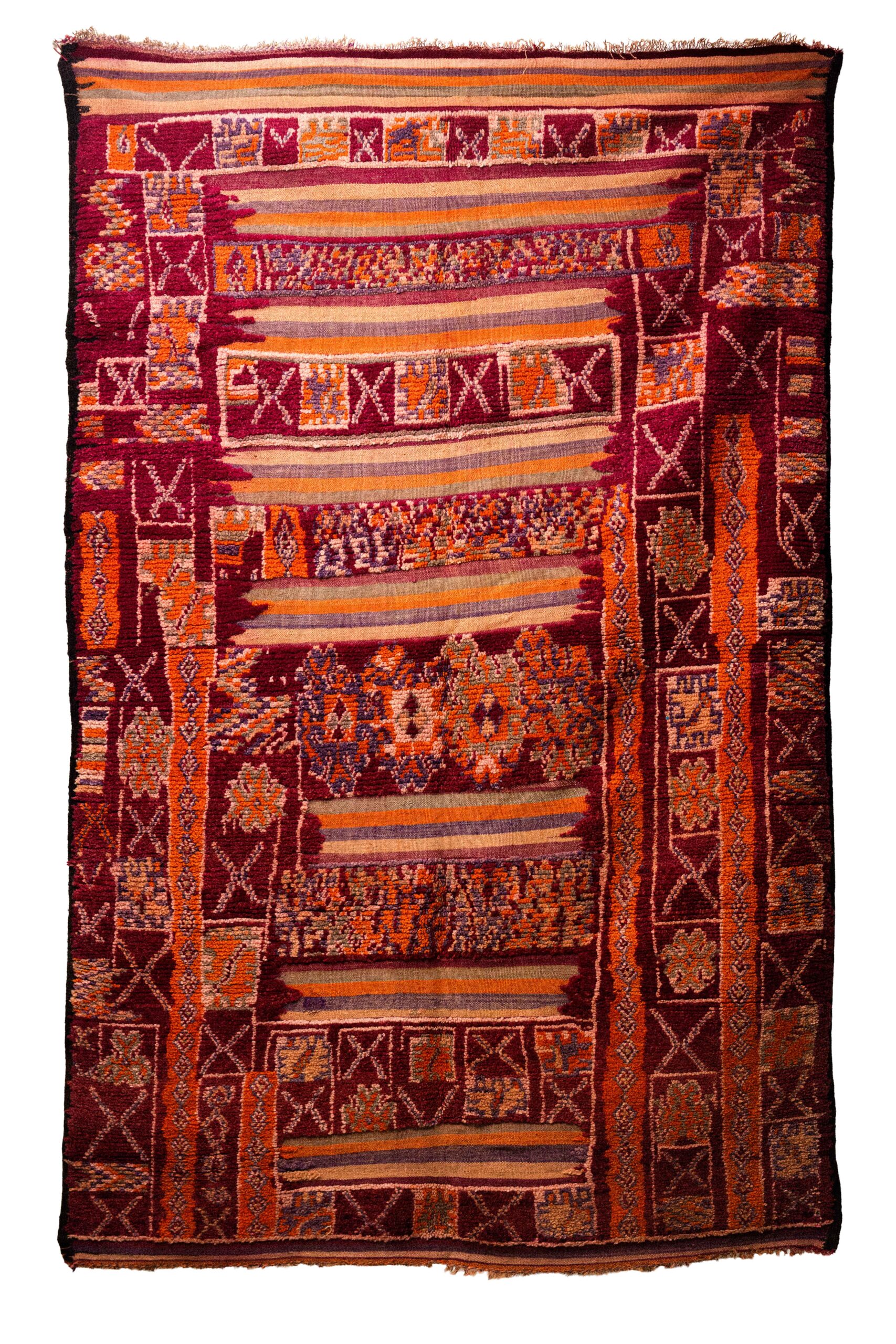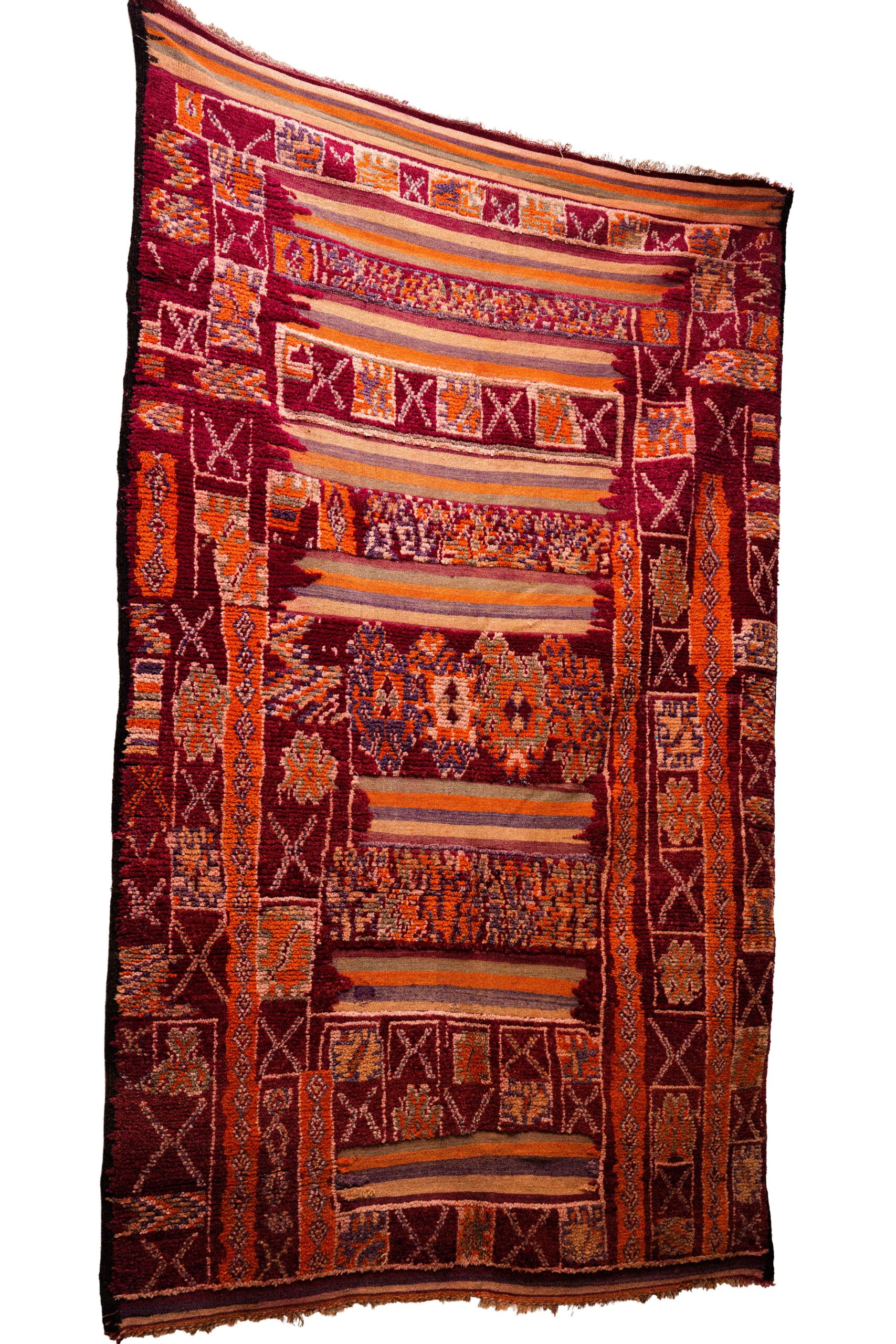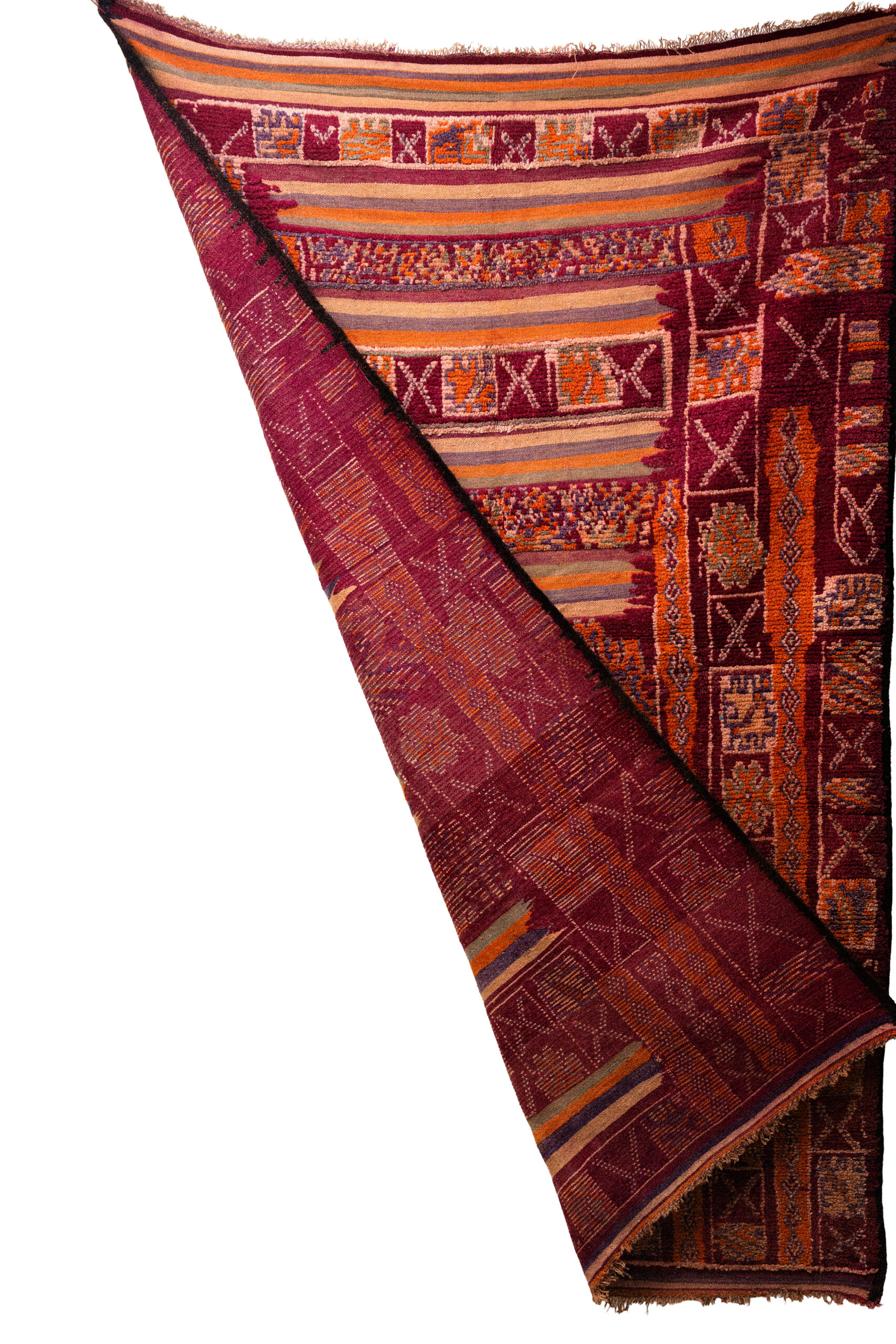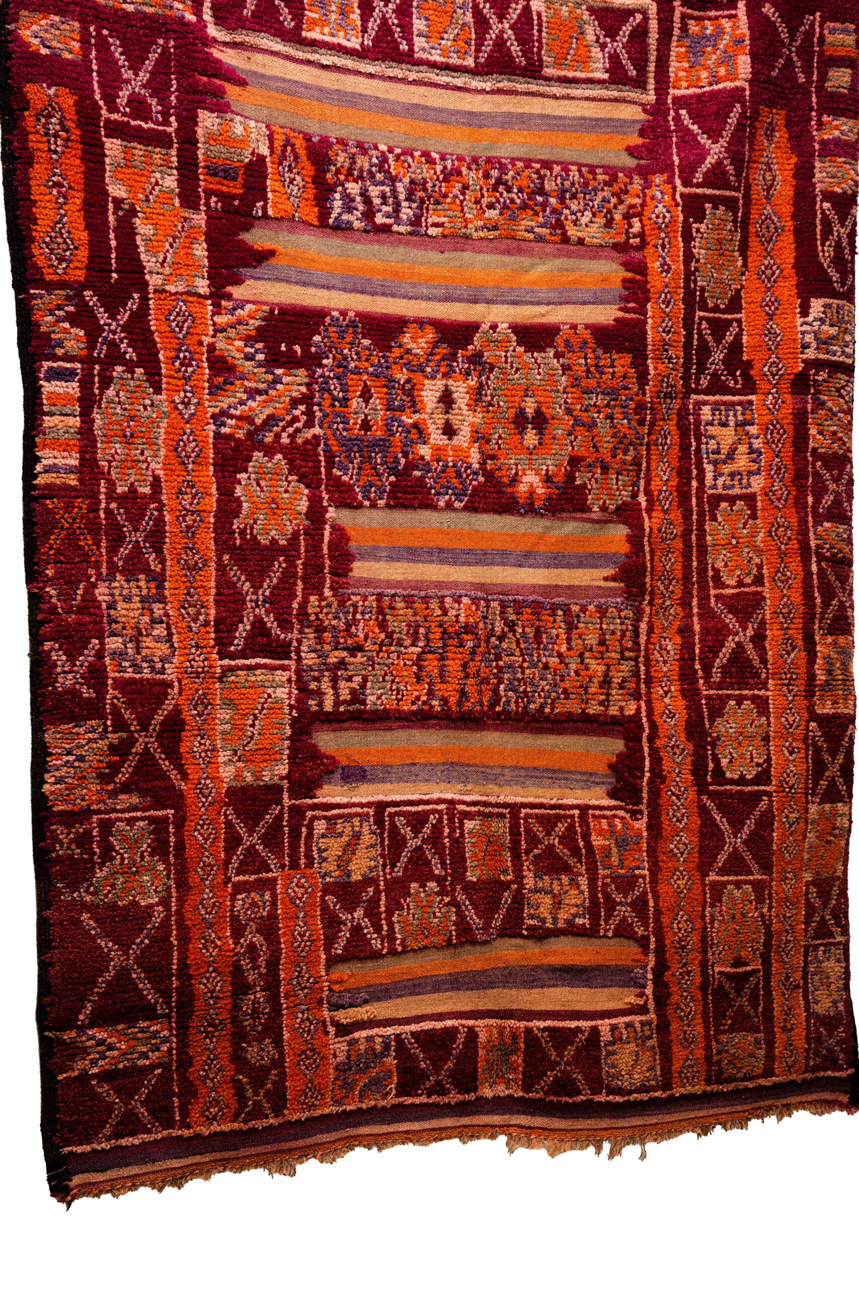 Color Palette & Patterns: The rug is deeply saturated in a striking palette of rich burgundy, magenta, fiery orange, and warm mustard yellow, accented by subtle hints of purple and white. The design is a highly complex, almost abstract geometric tapestry. It features an eclectic patchwork of traditional tribal motifs—including crosses, diamonds, and protective symbols—intricately woven into varying horizontal and vertical bands.