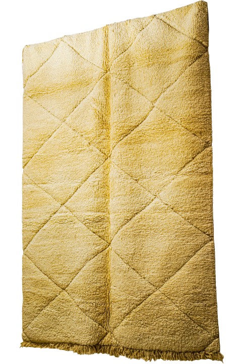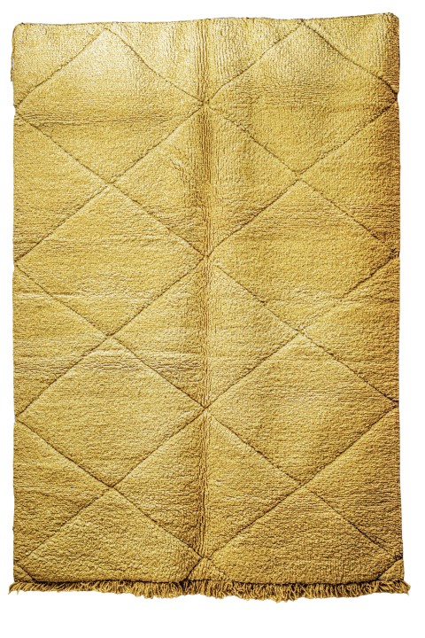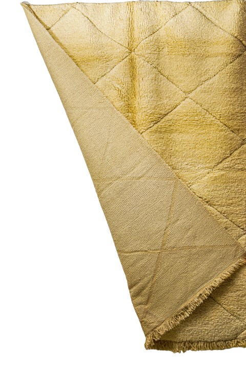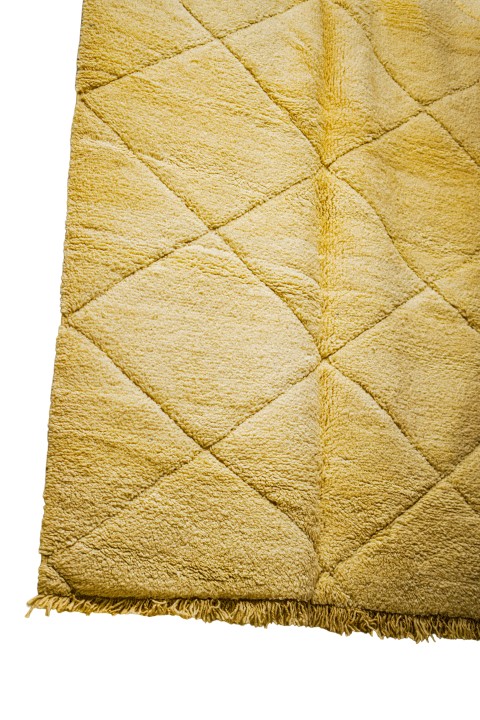 Texture : Il possède un poil très long et épais (haute pile), ce qui garantit une grande douceur et une chaleur typique des tapis Beni Ouarain. Il est fini par des franges épaisses.