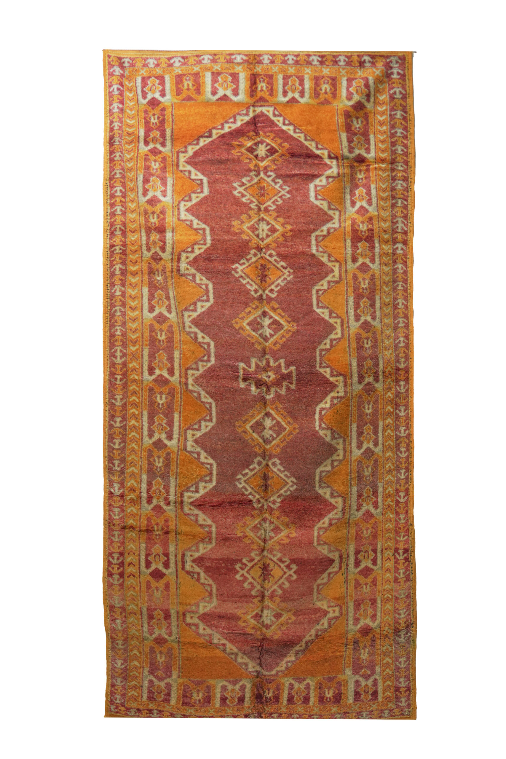 This hand-woven rug is an authentic Taznakht Berber carpet, prized for its striking length, traditional geometric patterns, and warm, earthy color palette.