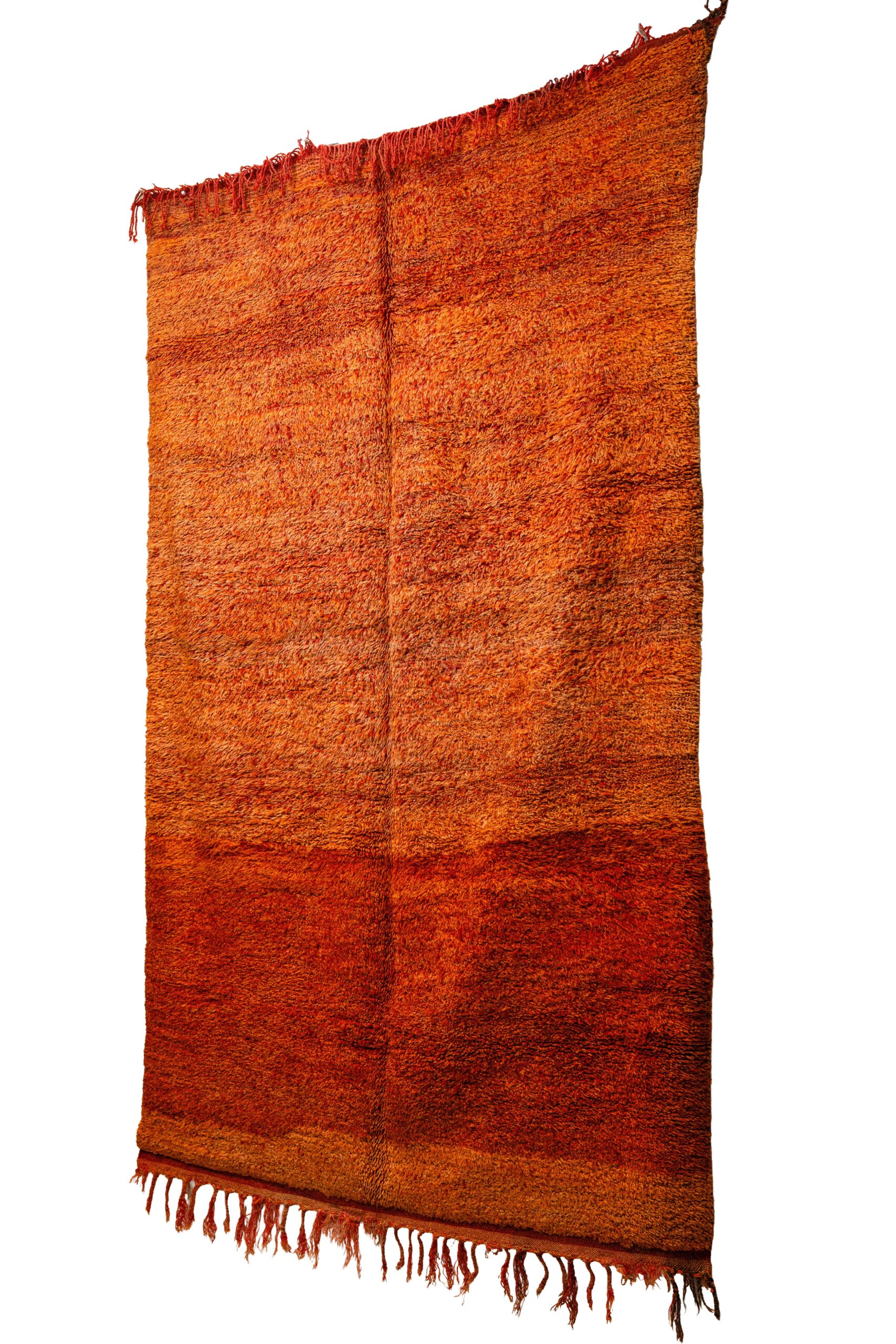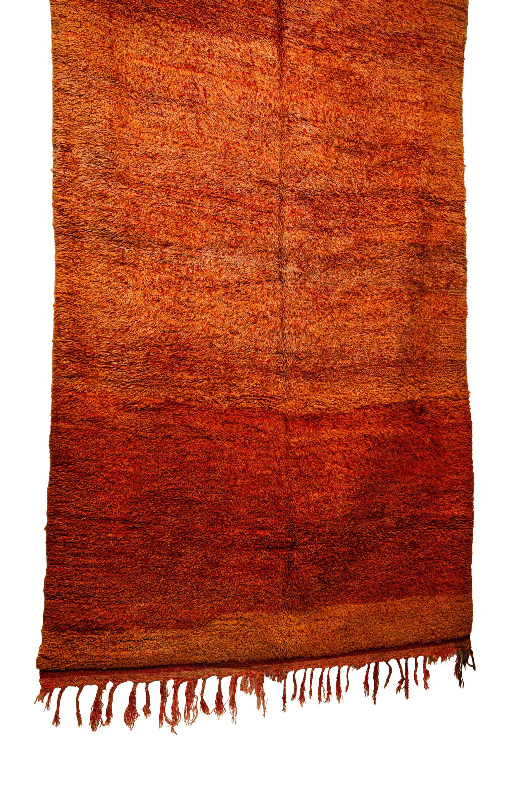 Color Palette & Texture: The rug features a stunning, highly saturated palette of fiery orange, deep terracotta, and warm amber. It showcases a beautiful natural abrash—a subtle gradient and variation in the dyed wool that adds incredible visual depth and a painterly quality to the piece. Weighing a substantial 11 kilograms, its dense, plush shaggy wool pile provides supreme underfoot comfort, exceptional durability, and undeniable coziness.